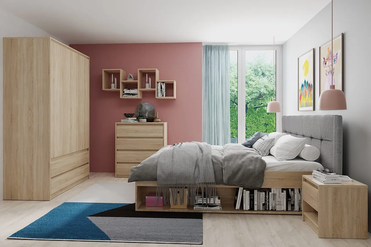 - Łóżko z pojemnikiem lub piętrowe (jeśli przestrzeń jest ograniczona) – nie tylko wygodne miejsce do snu, ale także sposób na sprytne przechowywanie pościeli, sezonowych ubrań lub książek.