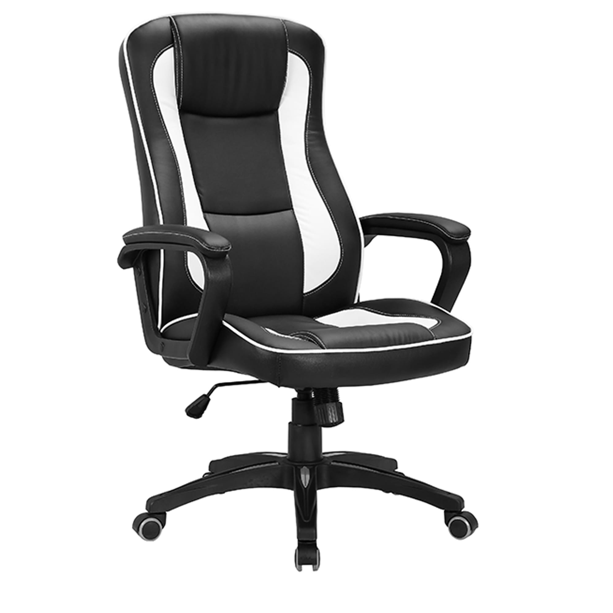 Fotel biurowy, obrotowy SEVORIN z tapicerowanymi podłokietnikami i podnośnikiem, czarna eko-skóra z białymi wstawkami, nogi chrom