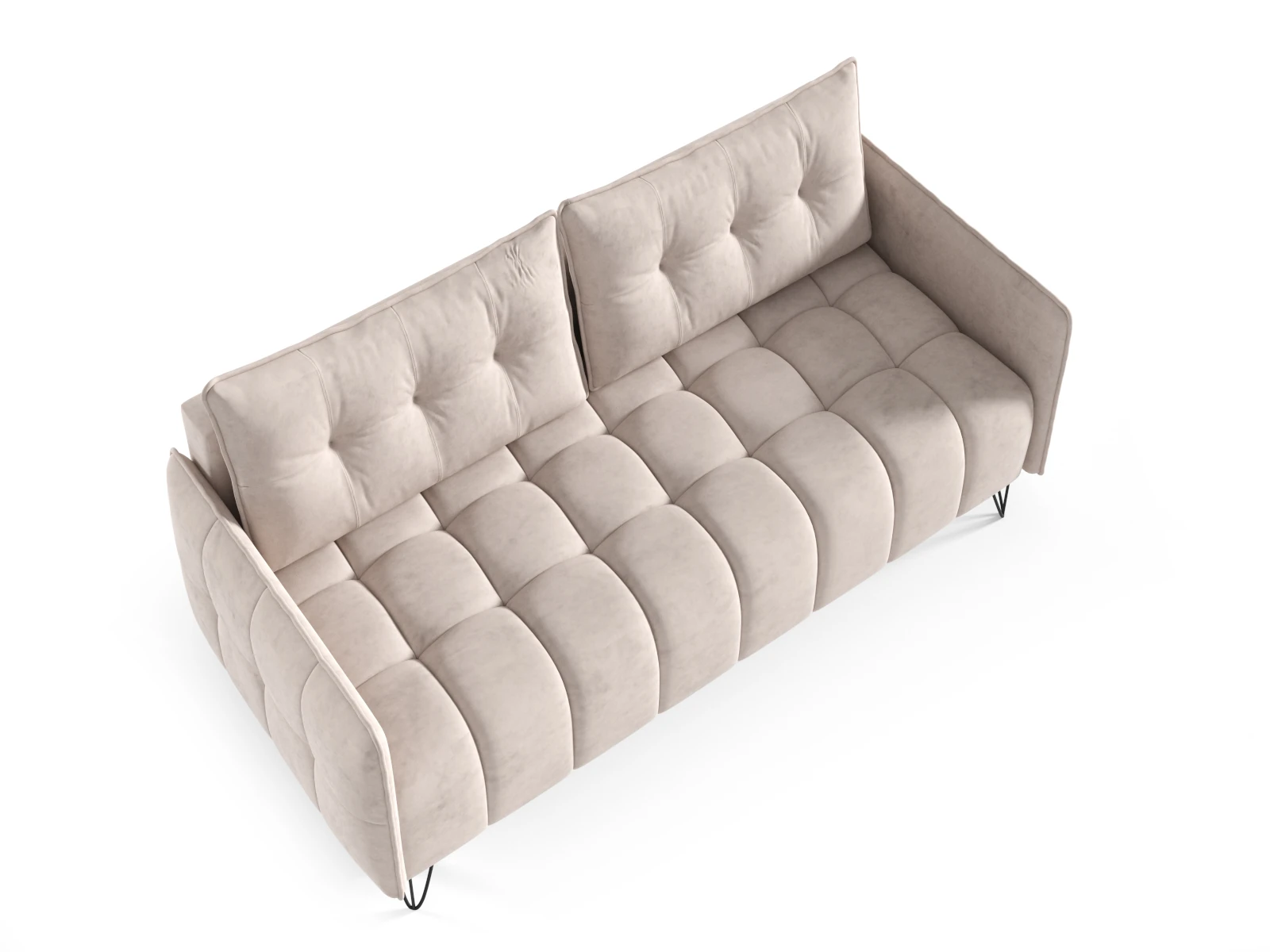 Ciemne, metalowe nogi nadają kanapie stabilności i eleganckiego wyglądu, jednocześnie zachowując lekkość wizualną. Tuftowanie na tapicerce, oprócz tego, że jest modnym elementem dekoracyjnym, także wpływa na komfort użytkowania, oferując delikatne wsparcie i miękkość.