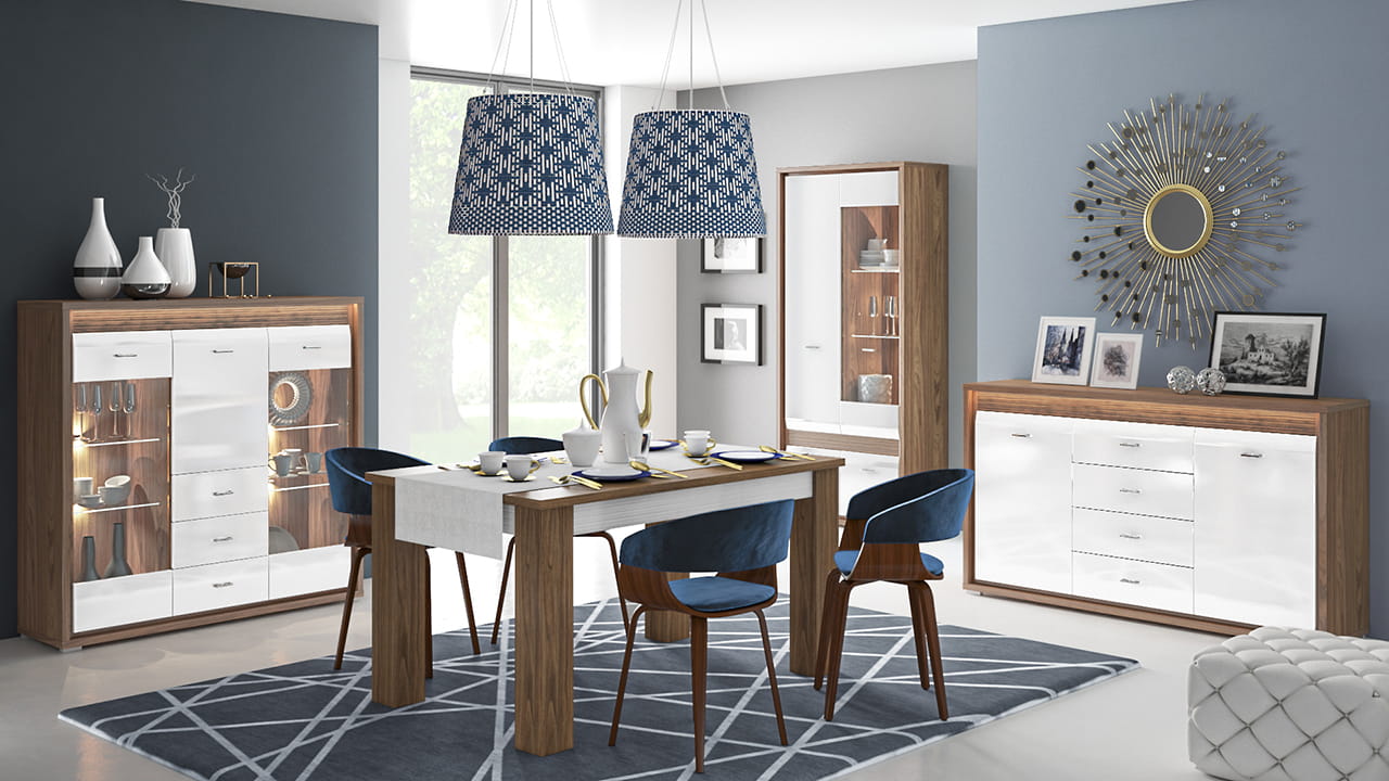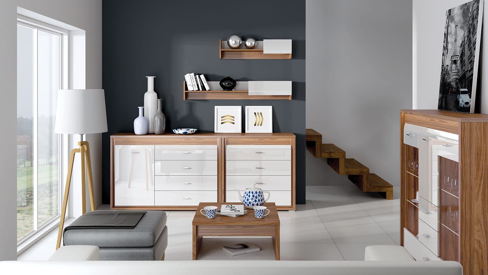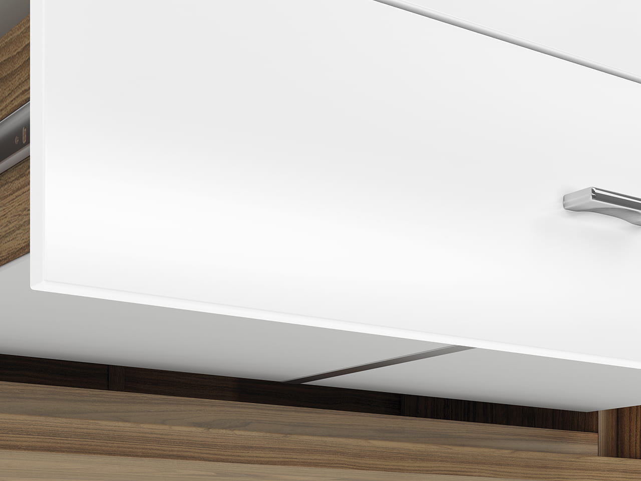 Interesująco prezentująca się komoda z linii MIRANDA przyciąga spojrzenie swoją oryginalna dwubarwna kolorystyką. Połączenie bieli z wybarwieniem w kolorze orzech naturalny daje niesamowity efekt wizualny, ale także wyróżnia mebel na tle przeróżnych stylizacji. Mebel dedykowany jest dla osób, które pragną stworzyć w swoim wnętrzu sielankową aranżacje z nutą współczesnych trendów.
