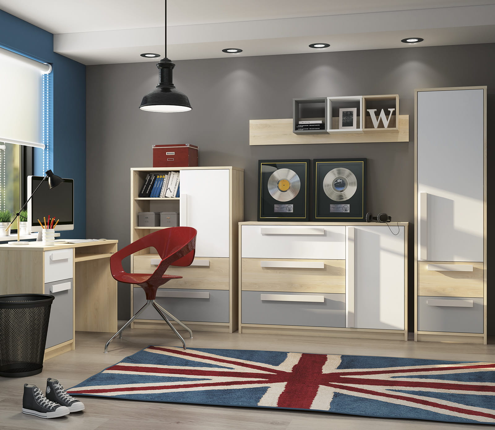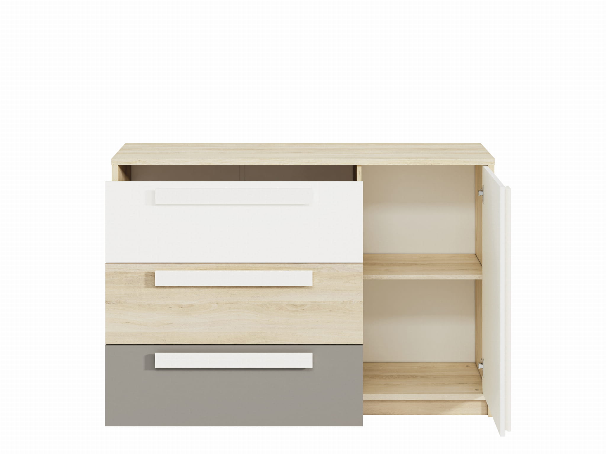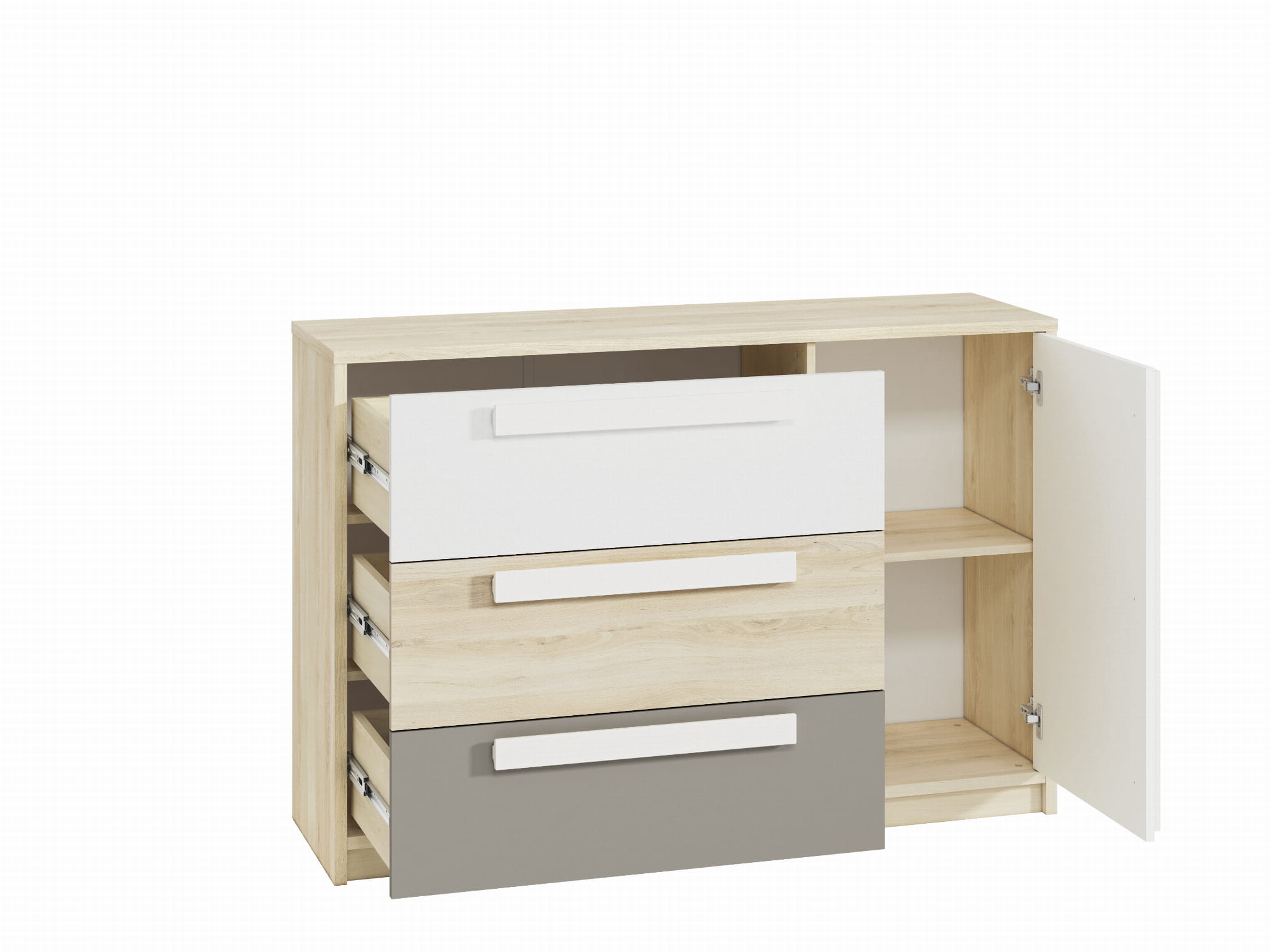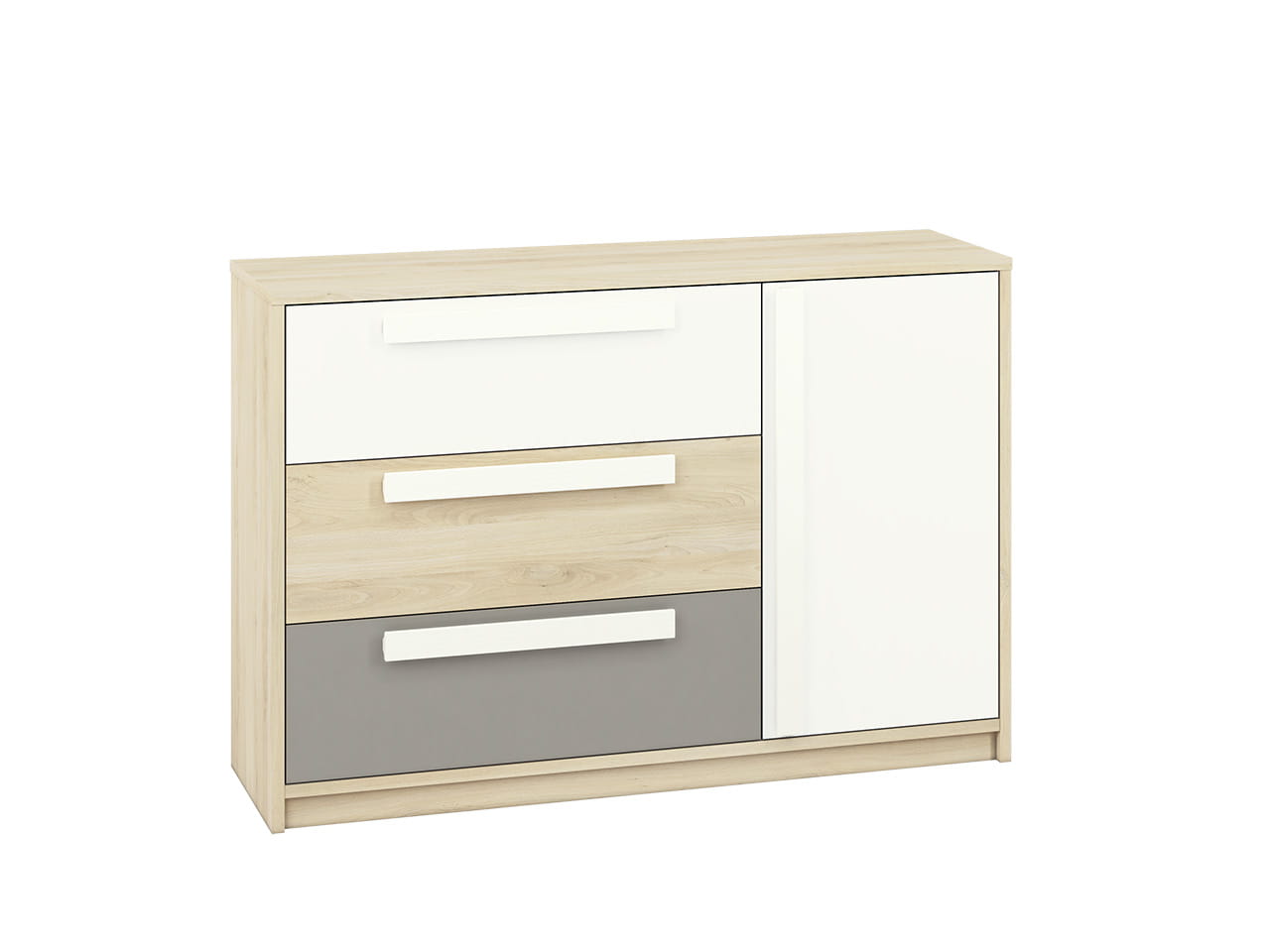 Niska funkcjonalna komoda z trzema szufladami i szafką. Komoda posiadająca trzy pakowne duże szuflady, szafka pomieści dodatkowe przedmioty. Na komodę można ustawić ramki na zdjęcia czy inne dekoracje. Modernistyczny system meblowy Nordo dedykowany do pokojów młodzieżowych i dziecięcych. Meble z kolekcji Nordo charakteryzują się korpusem w jasnym odcieniu drewna dąb fjord. Fronty w kolorze białym, dąb fjord i dwóch szarościach do wyboru, delikatnym jasnym szarym i wyrazistszej szarej platyny. Podłużne szeroki uchwyty w kolorze białym ułatwiają otwieranie szafek i szuflad mebla. Szeroki wachlarz wyboru brył z kolekcji. Meble Nordo to możliwość wielu zestawień i wyboru kolorów drzwiczek i ich rozmieszczenia w wielu meblach. Skandynawski design wybarwienia jasnego odcienia dębu zestawionego z bielą i szarościami to trend na czasie. Meble ciekawie prezentują się zarówno na tle barw pastelowych jak i z wyrazistymi dodatkami. polecane w szczególności jako zestawy do pokojów dziecięcych i młodzieżowych. Meble z powodzeniem doskonale sprawdzą się w innych pomieszczeniach, jak pokój dzienny, sypialnia czy też przedpokój.