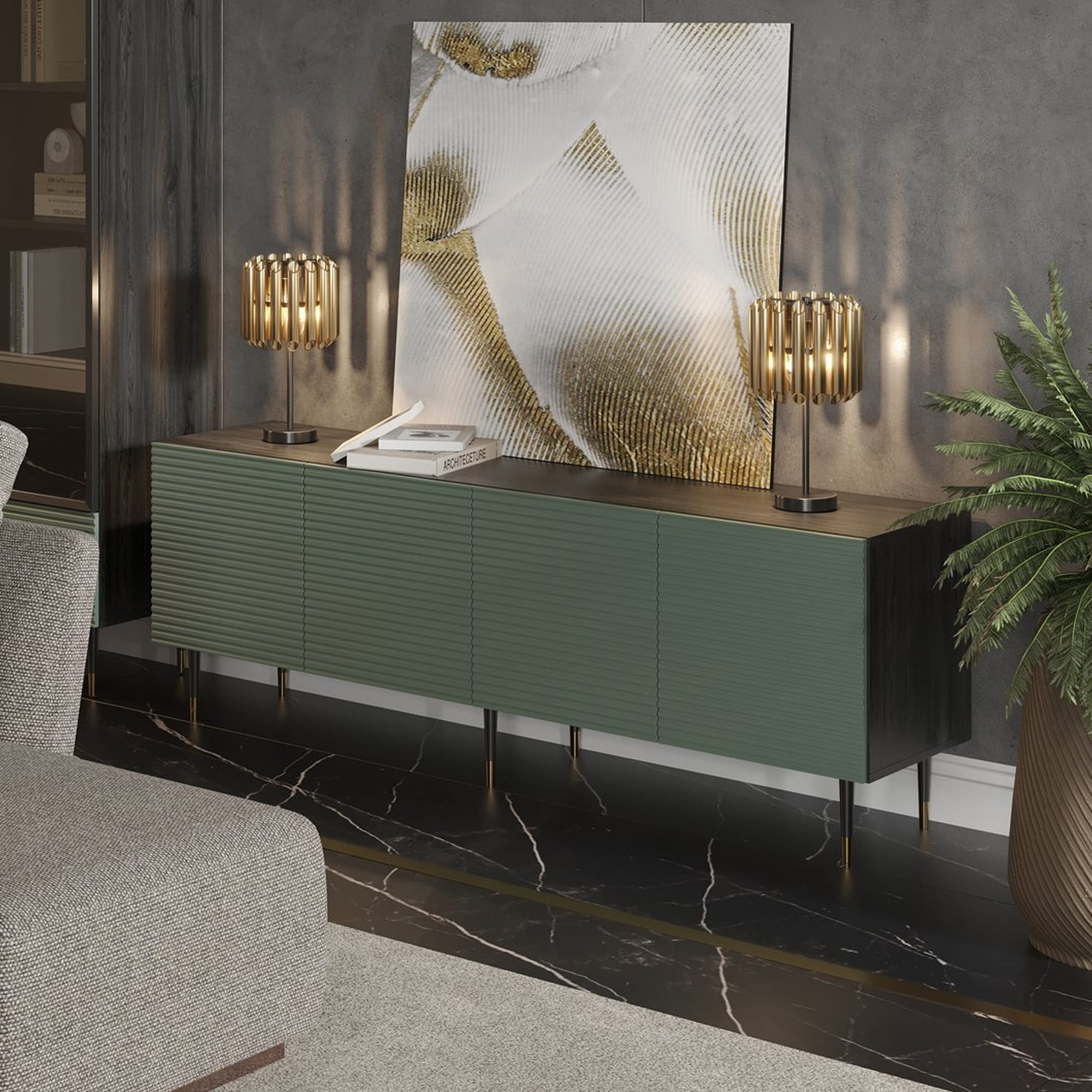 Komoda ryflowana MIXTURIAL czterodrzwiowa 180 cm czarna / pistacjowa zieleń, nogi złote