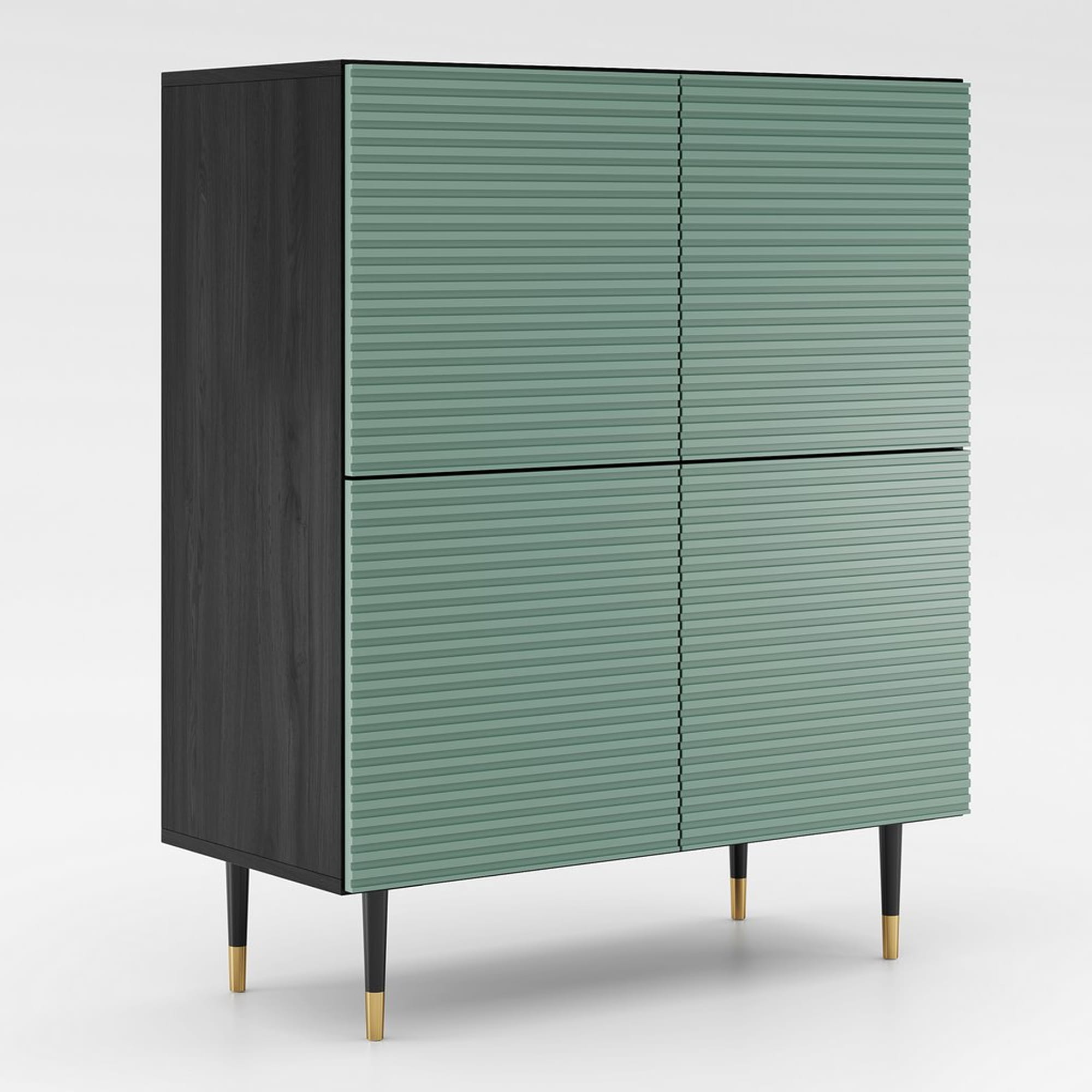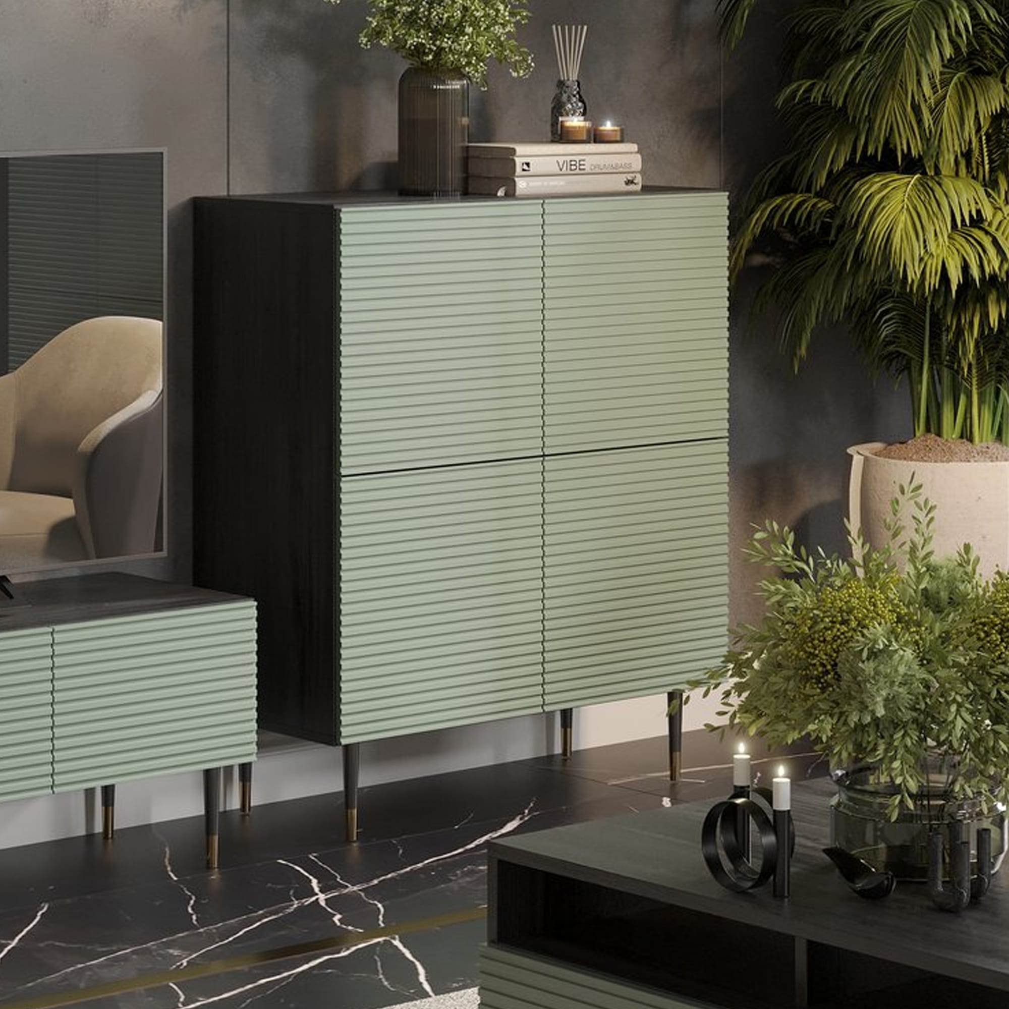 Komoda ryflowana MIXTURIAL czterodrzwiowa 90 cm - czarna, pistacjowa zieleń, nogi złote