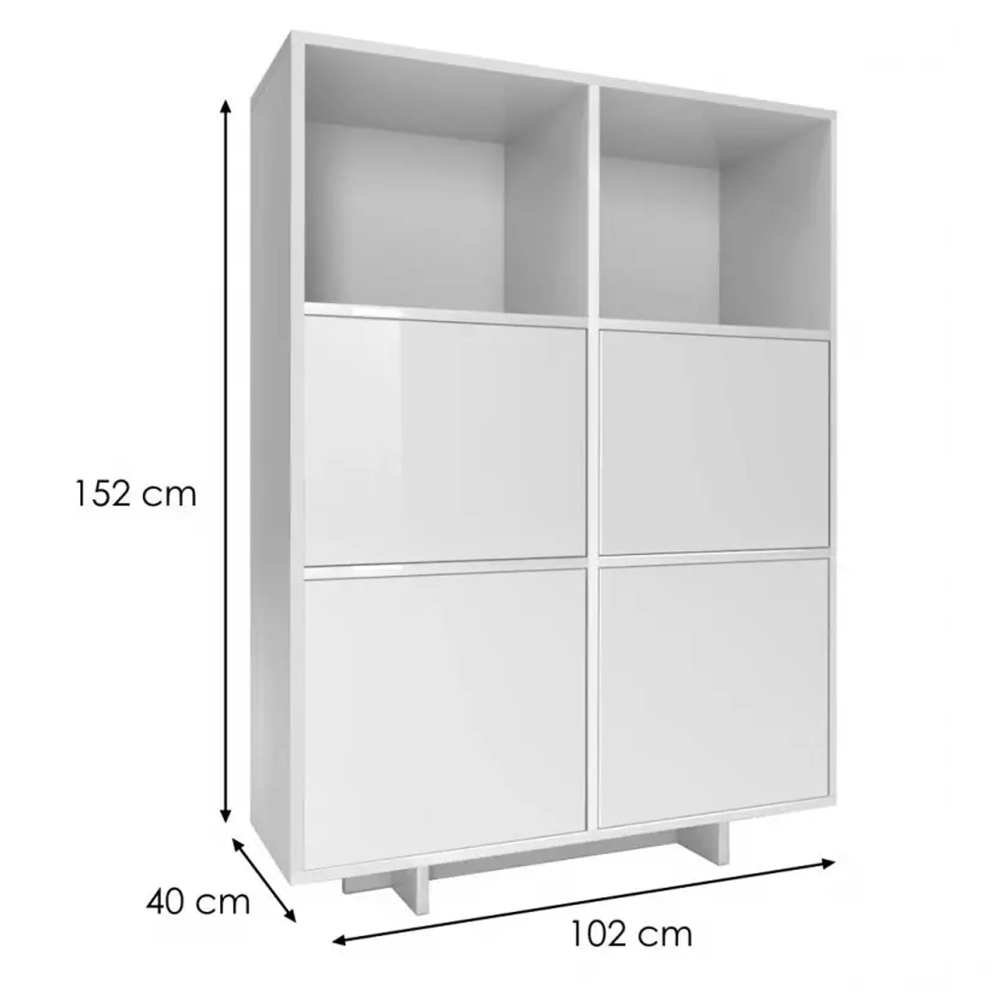 Komoda z regałami MUMO w eleganckim, białym wykończeniu to nowoczesny mebel, który wprowadza lekkość i świeżość do wnętrza. Czterodrzwiowa konstrukcja o szerokości 102 cm, zapewnia dużo przestrzeni do przechowywania, a jej prosta forma doskonale wpisuje się w styl skandynawski i minimalistyczny. Biały kolor dodaje wnętrzu przestronności, podkreślając elegancję mebla.