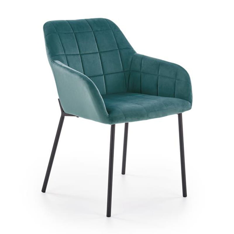 Krzesło K305 to krzesło bardzo nowoczesne i solidne. Konstrukcja opiera się na prostych nogach ze stali malowanej proszkowo w kolorze czarnym zaś oparcie zostało pokryte pikowanym zielonym welurem. Idealnie sprawdzi się przy stole w Twojej jadalni czy toaletce ponieważ krzesło swoim wyglądem jest doskonałym kompromisem pomiędzy tradycyjnym krzesłem, a nowoczesnym fotelem.