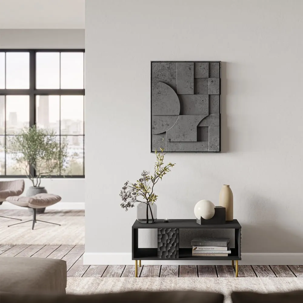 System meblowy BLACKMOUR to bardzo elegancki i stylowy sposób na odświeżenie wnętrza. Meble są wykonane z płyty meblowej, w kolorze czarnym, z dekorem 3D w formie wgłębień na frontach. Złoty detal w postaci cienkich nóżek sprawia, ze całość wygląda bardzo elegancko i luksusowo.