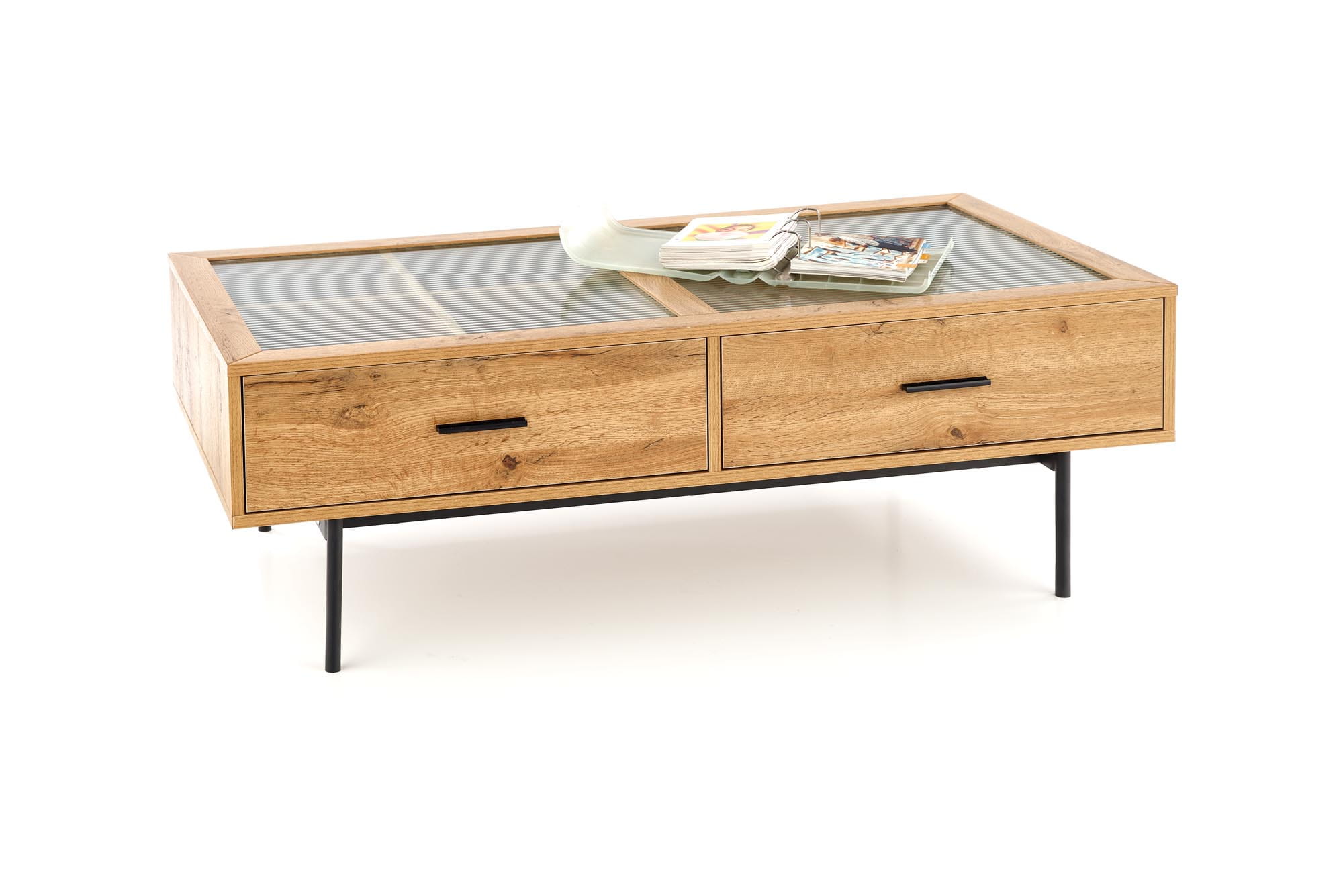 Nowoczesna ława Costanza umieszczona jest na czterech nóżkach wykonanych ze stali malowanej proszkowo na kolor czarny. Minimalistyczna podstawa dodaje całemu meblowi lekkości – dodatkowo świetnie komponuje się z czarnymi uchwytami. Model Costanza wyposażony jest w dwie wysuwane szuflady. Jedna z nich jest podzielona na cztery części, dzięki czemu można w niej posegregować drobne akcesoria. Wnętrze szuflad jest widoczne, ponieważ blat wykonano z subtelnie ryflowanego szkła. Prezentowana ława została wykonana z płyty MDF okleinowej w odcieniu dąb naturalny, na którym widoczne jest usłojenie drewna. Naturalna kolorystyka drewna doskonale współgra z czarnymi wstawkami oraz transparentnym szkłem, tworząc estetyczny mebel, obok którego nikt nie przejdzie obojętnie. Ława Costanza nie tylko będzie stylowym elementem wyposażenia salonu, ale również praktycznym meblem, dzięki któremu w pomieszczeniu zapanuje ład i porządek