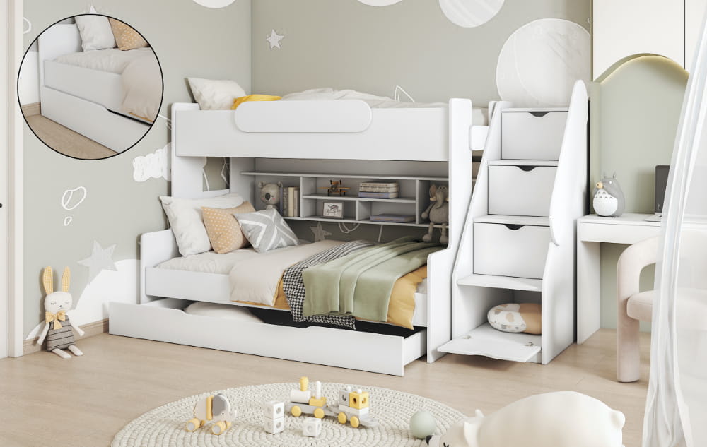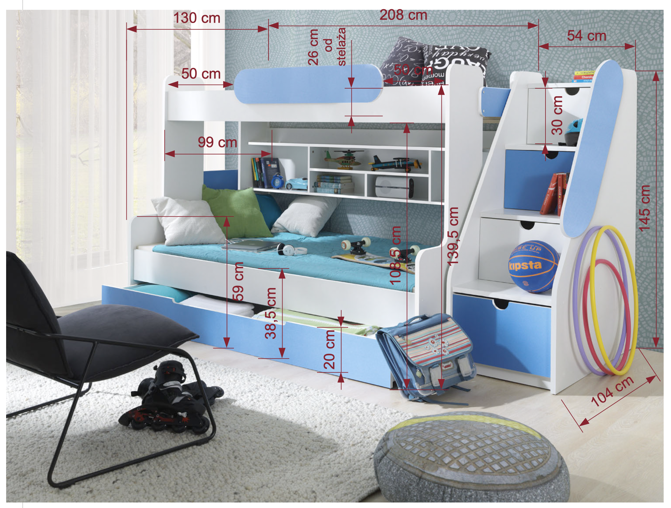 Realizacja tego mebla odbywa się przy użyciu 22-milimetrowej płyty laminowanej, gwarantującej solidność oraz trwałość, a obrzeża zabezpieczone są materiałem ABS, zwiększającym wytrzymałość na codzienne użycie. Niezwykle praktyczne schody dostosowują się do aranżacji przestrzeni – ich umiejscowienie można dopasować zarówno z prawej, jak i z lewej strony. Ponadto, schody służą również jako wszechstronny regał, miejsce na książki lub ukochane zabawki maluchów.
