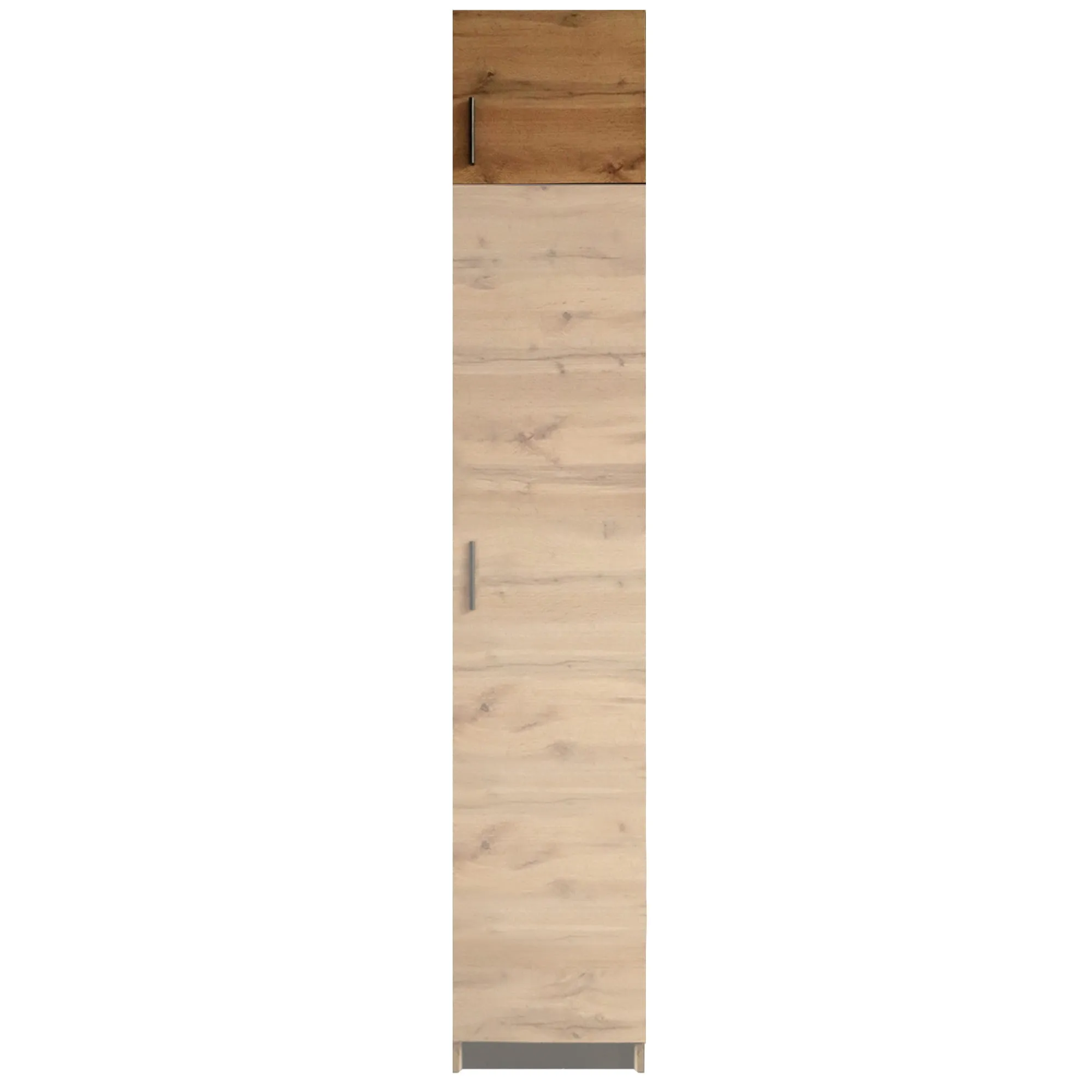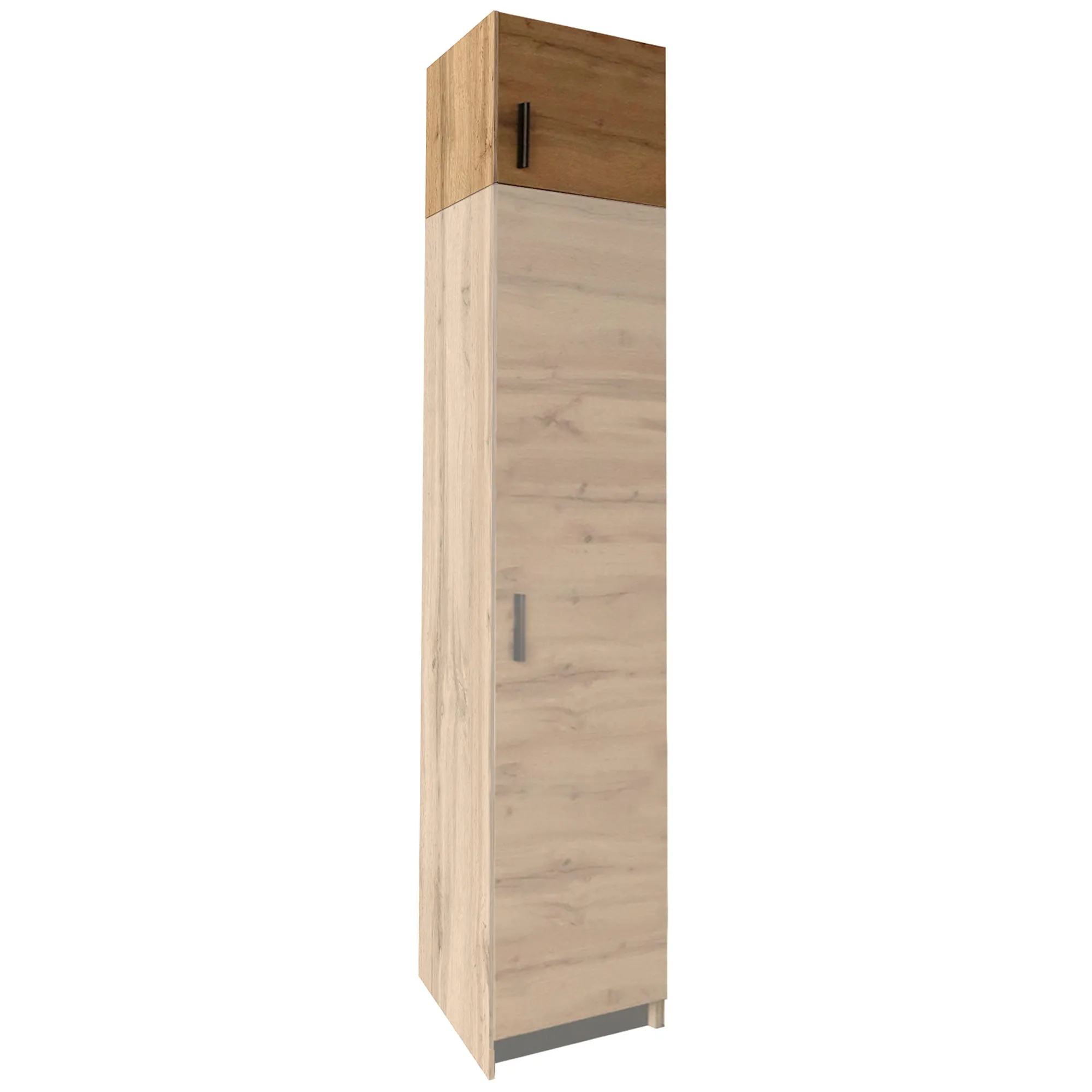 Pojemna nadstawka do szafy Esperanza w kolorze dąb wotan. Nadstawka to idealne rozwiązanie do wykorzystania przestrzeni nad szafą. Pakowne wnętrze ukryte za parą drzwiczek świetnie się przyda na rzeczy, po które sięgasz okazjonalnie i które nie są Ci potrzebne podczas codziennego użytku, ale również potrzebują swojego miejsca. Kolejnym atutem tego modelu jest idealne dopasowanie pod każdym względem do szafy Esperanza. Korzystając z takiego rozwiązania zyskujesz nie tylko dodatkową przestrzeń, ale także spójną i harmonijną aranżację.