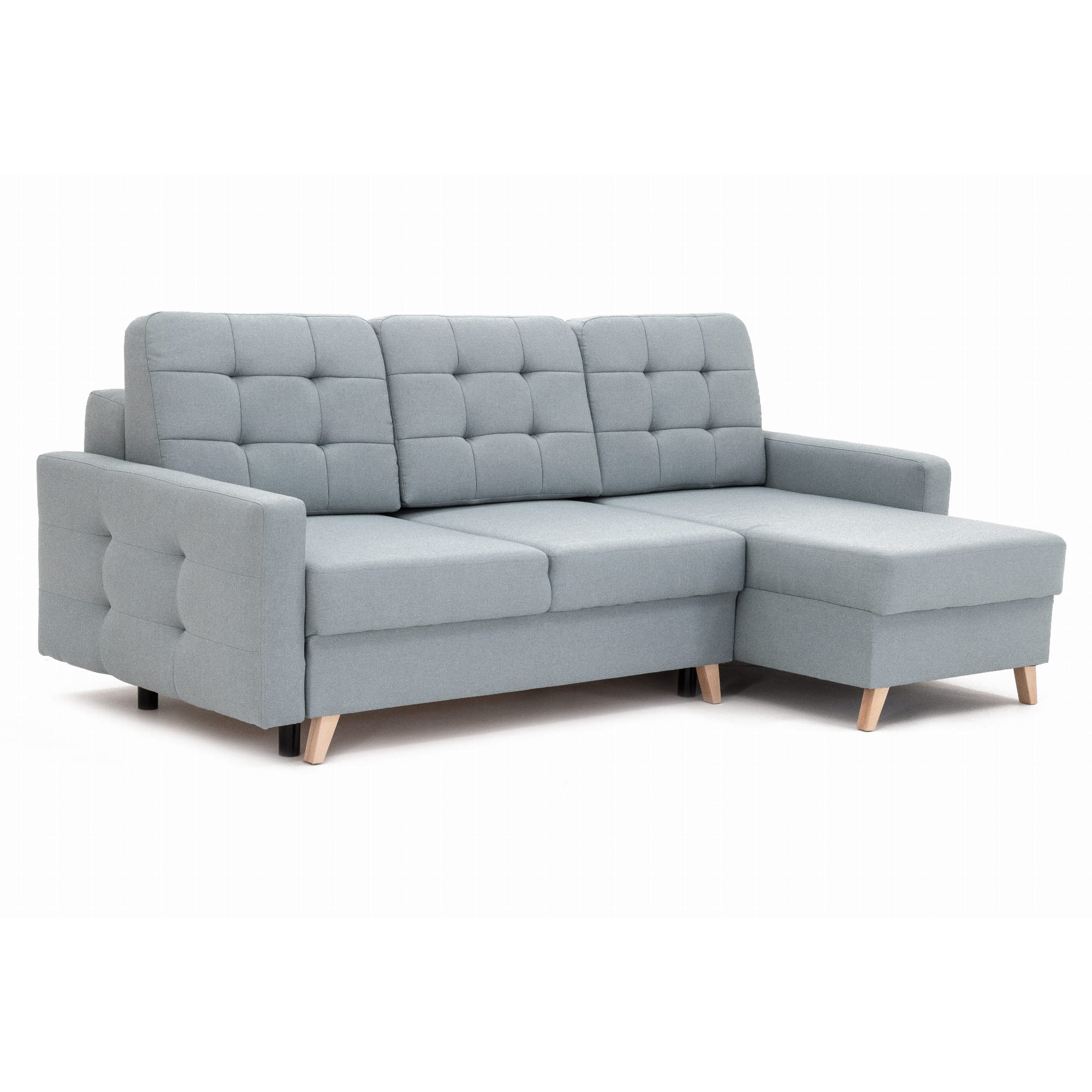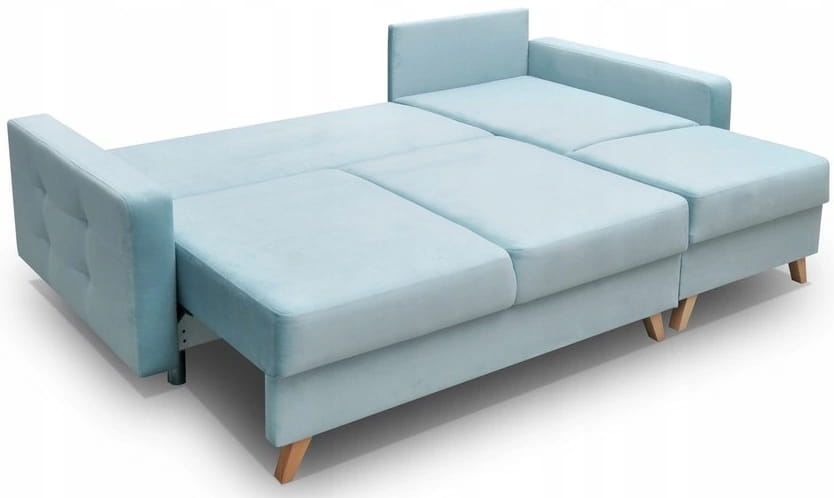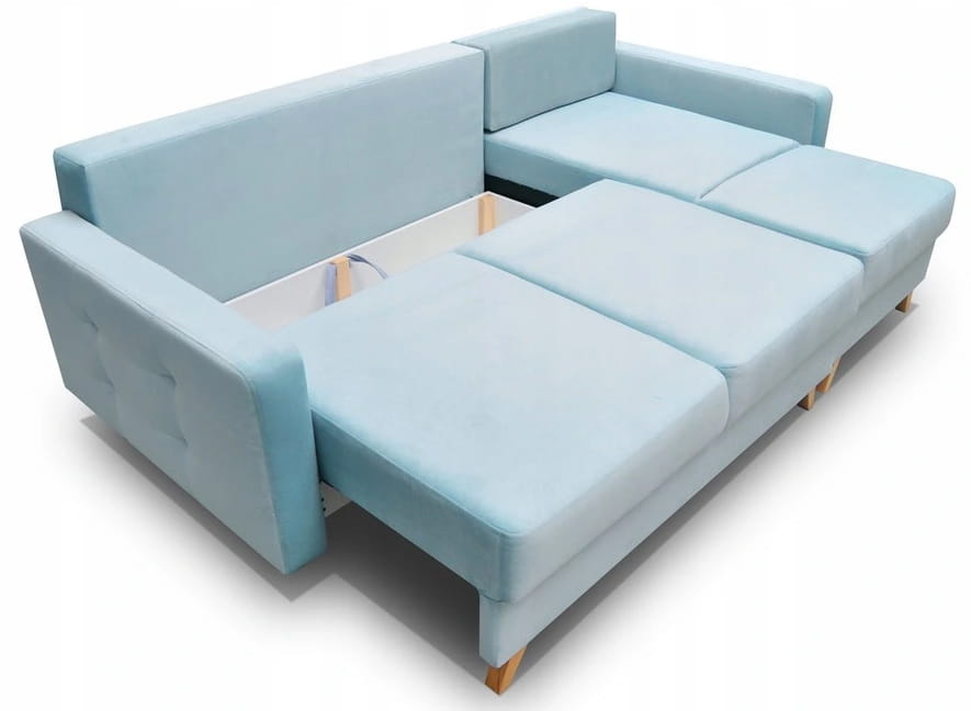 Narożnik wyposażony jest w obszerny pojemnik na pościel, który umieszczony został pod siedziskiem. Wygodne otwieranie i objętość pojemnika pozwoli trzymać w nim pościel, koce oraz poduszki.