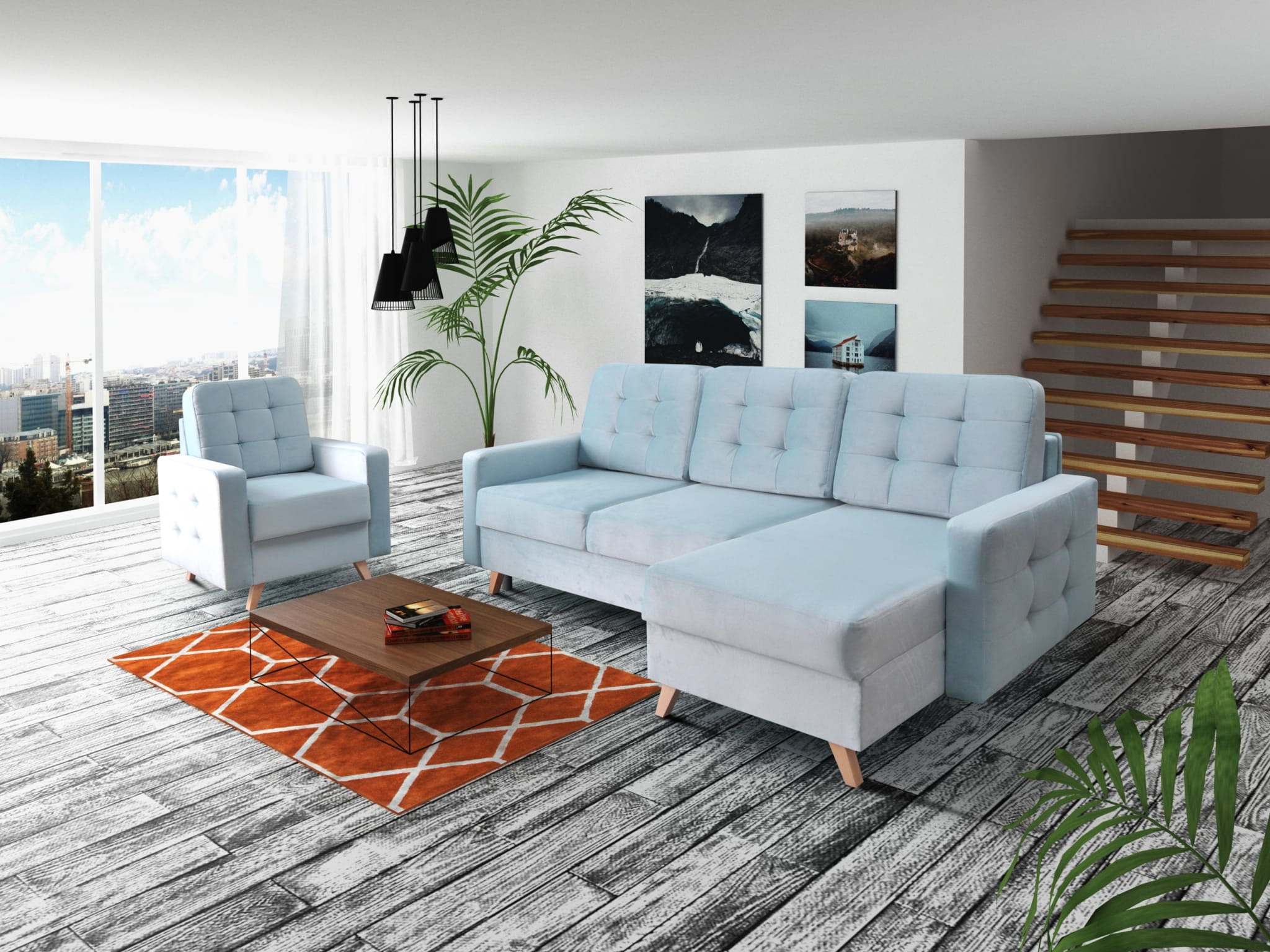 Narożnik REVANGE uniwersalny z funkcją spania błękit 236x151 cm