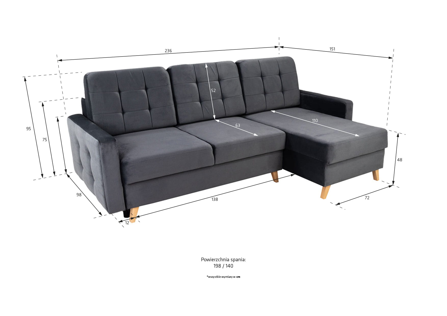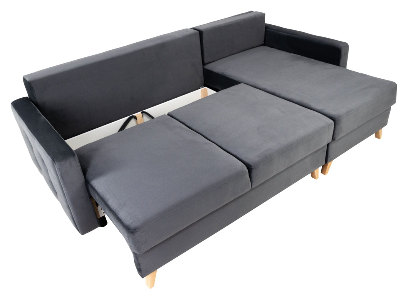 Narożnik wyposażony jest w obszerny pojemnik na pościel, który umieszczony został pod siedziskiem. Wygodne otwieranie i objętość pojemnika pozwoli trzymać w nim pościel, koce oraz poduszki.