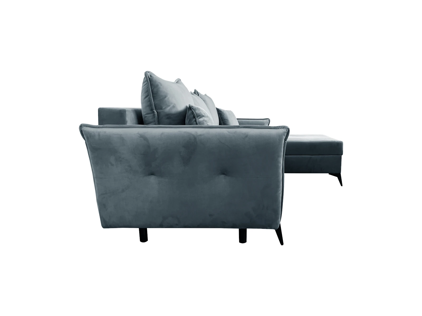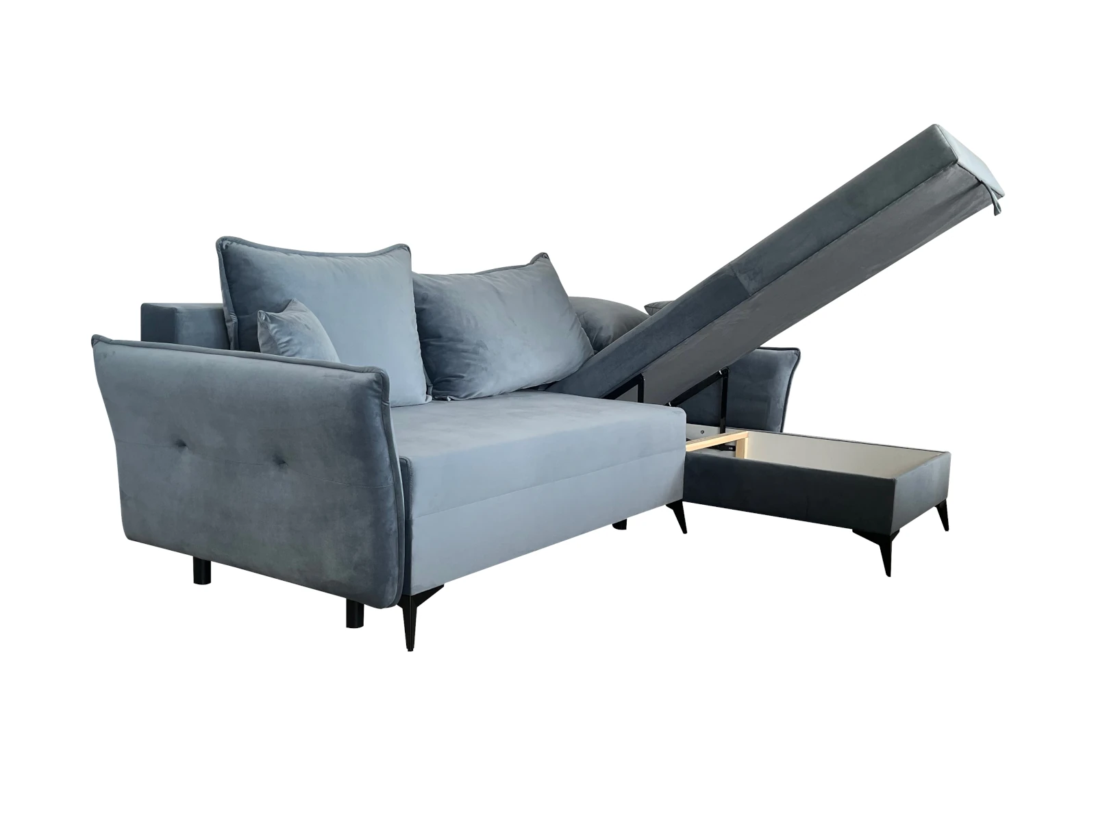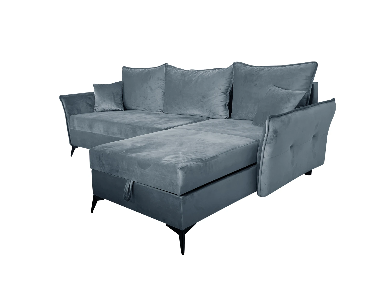 Dodatkowym atutem jest funkcja rozkładania, która w kilka chwil zamienia narożnik w wygodne łóżko, idealne do okazjonalnego spania. Pojemnik na pościel to praktyczne rozwiązanie, które pomaga utrzymać porządek i przechować niezbędne tekstylia.