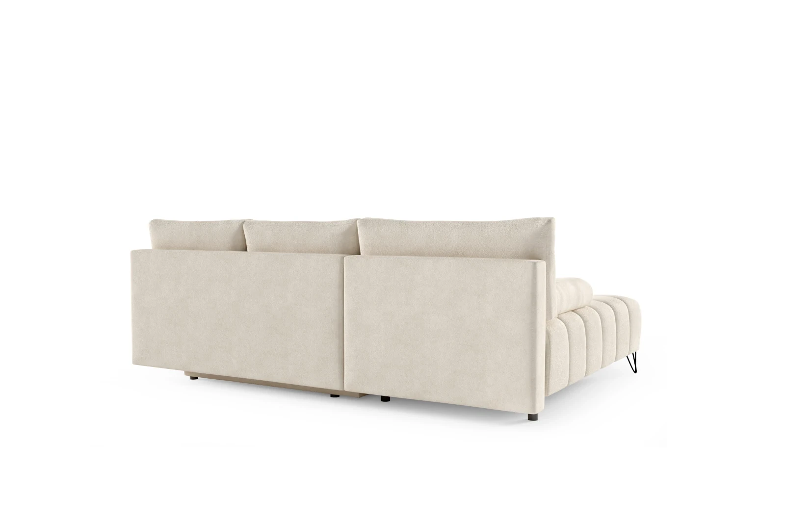 Stylowe, subtelne guziki na oparciu i siedzisku podkreślają tuftowane wykończenie, nadając narożnikowi retro charakter, który pasuje do nowoczesnych wnętrz, gdzie klasyka spotyka się z odrobiną ekstrawagancji. Smukłe, czarne nogi nadają całości lekkości, tworząc wrażenie unoszącego się mebla.
