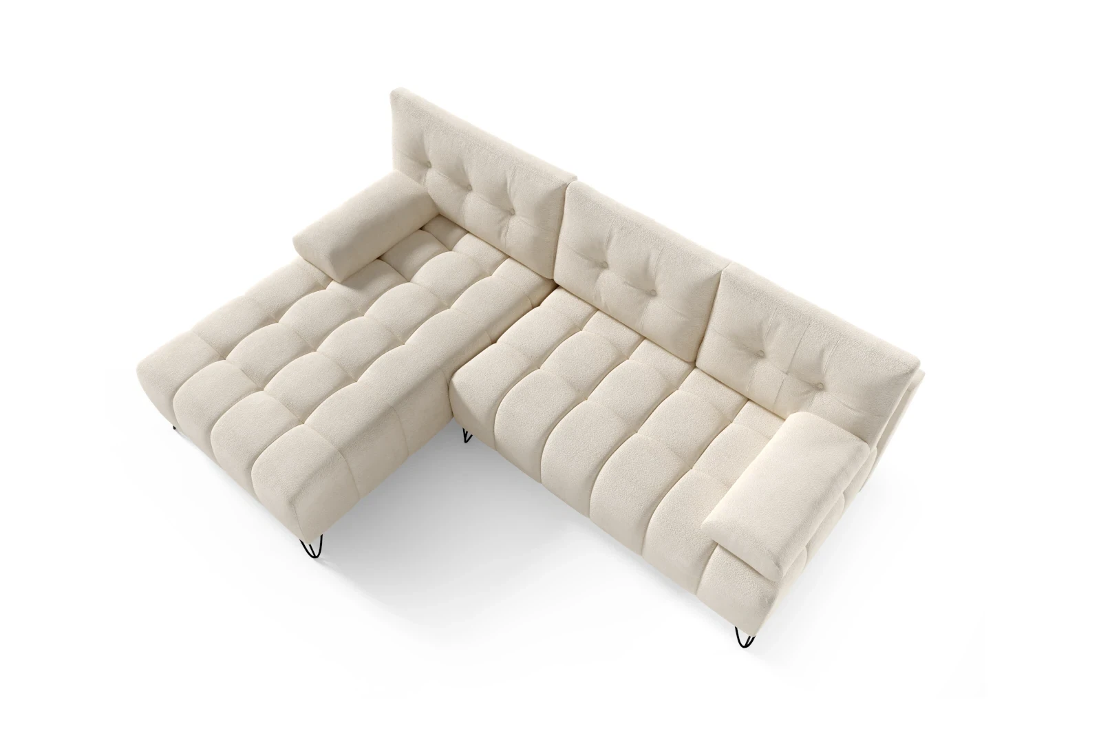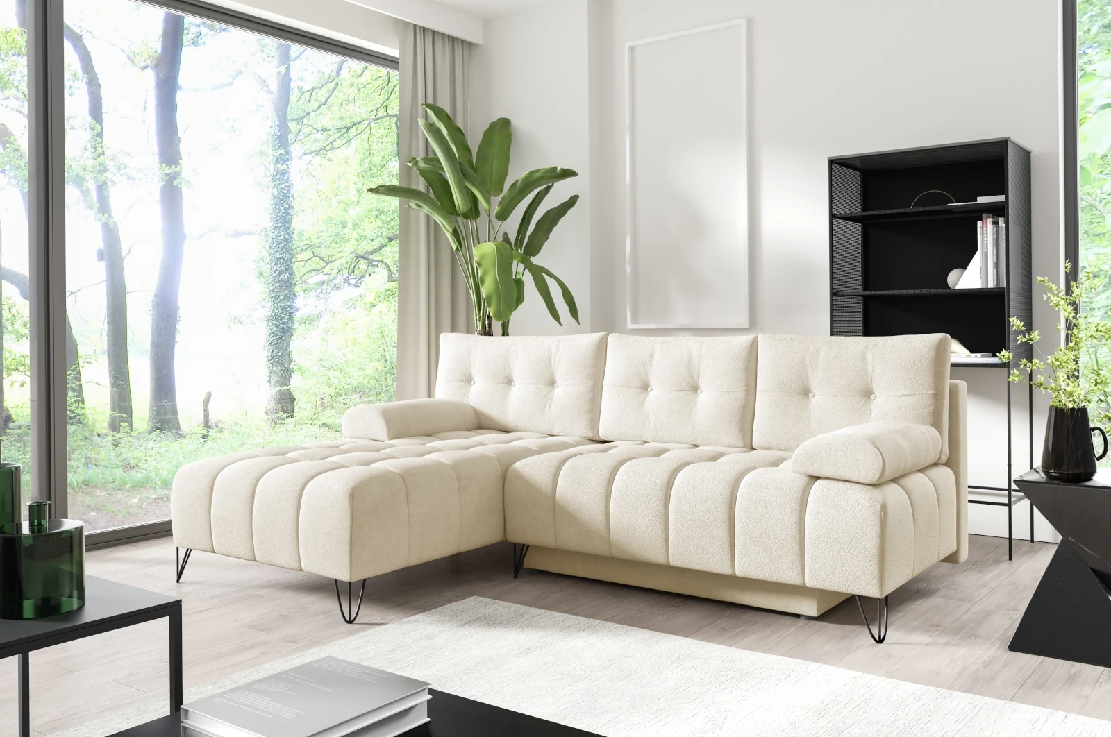 Jest to idealna propozycja dla tych, którzy cenią komfort i nowoczesny design. Dzięki wyjątkowej konstrukcji zapewnia komfort na najwyższym poziomie, z przestronnym siedziskiem i wygodnymi poduszkami na oparciu. Z tym narożnikiem każda chwila spędzona w salonie będzie wyjątkowa.