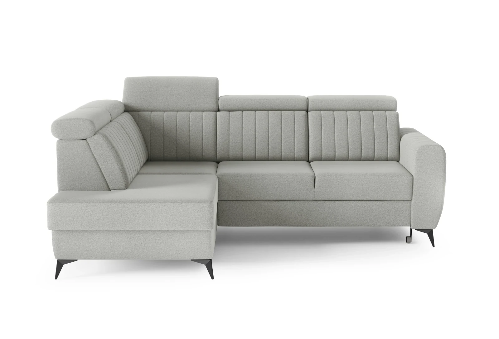 Pionowe przeszycia na oparciu nadają narożnikowi wyjątkowego charakteru, a subtelne, czarne nogi wprowadzają do całości lekkość, sprawiając, że mebel niemal unosi się w powietrzu. Jego nowoczesny wygląd świetnie wpasuje się zarówno w przestronne salony, jak i mniejsze mieszkania, dodając wnętrzu stylu, nie przytłaczając go.