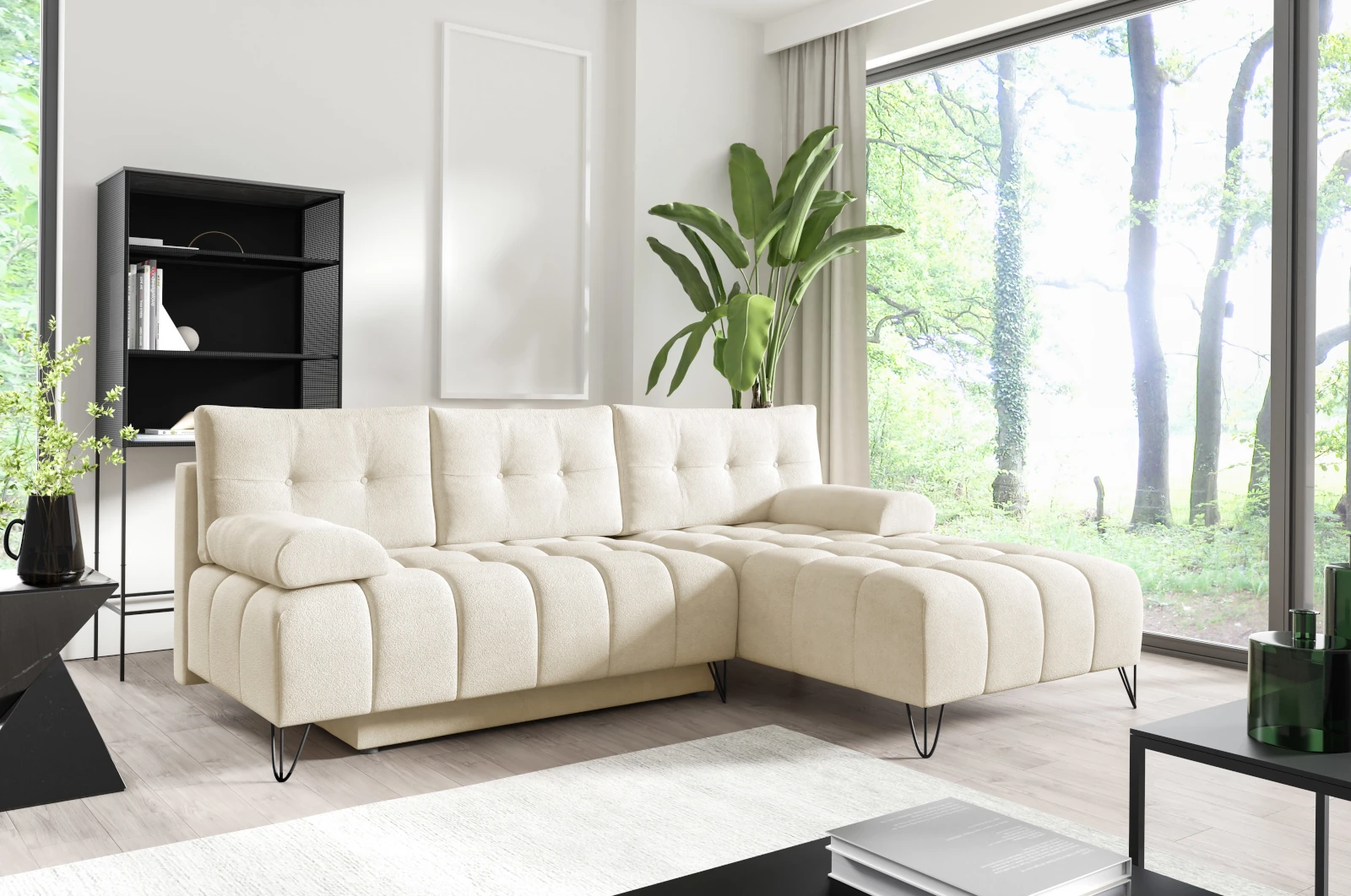 Jest to idealna propozycja dla tych, którzy cenią komfort i nowoczesny design. Dzięki wyjątkowej konstrukcji zapewnia komfort na najwyższym poziomie, z przestronnym siedziskiem i wygodnymi poduszkami na oparciu. Z tym narożnikiem każda chwila spędzona w salonie będzie wyjątkowa.