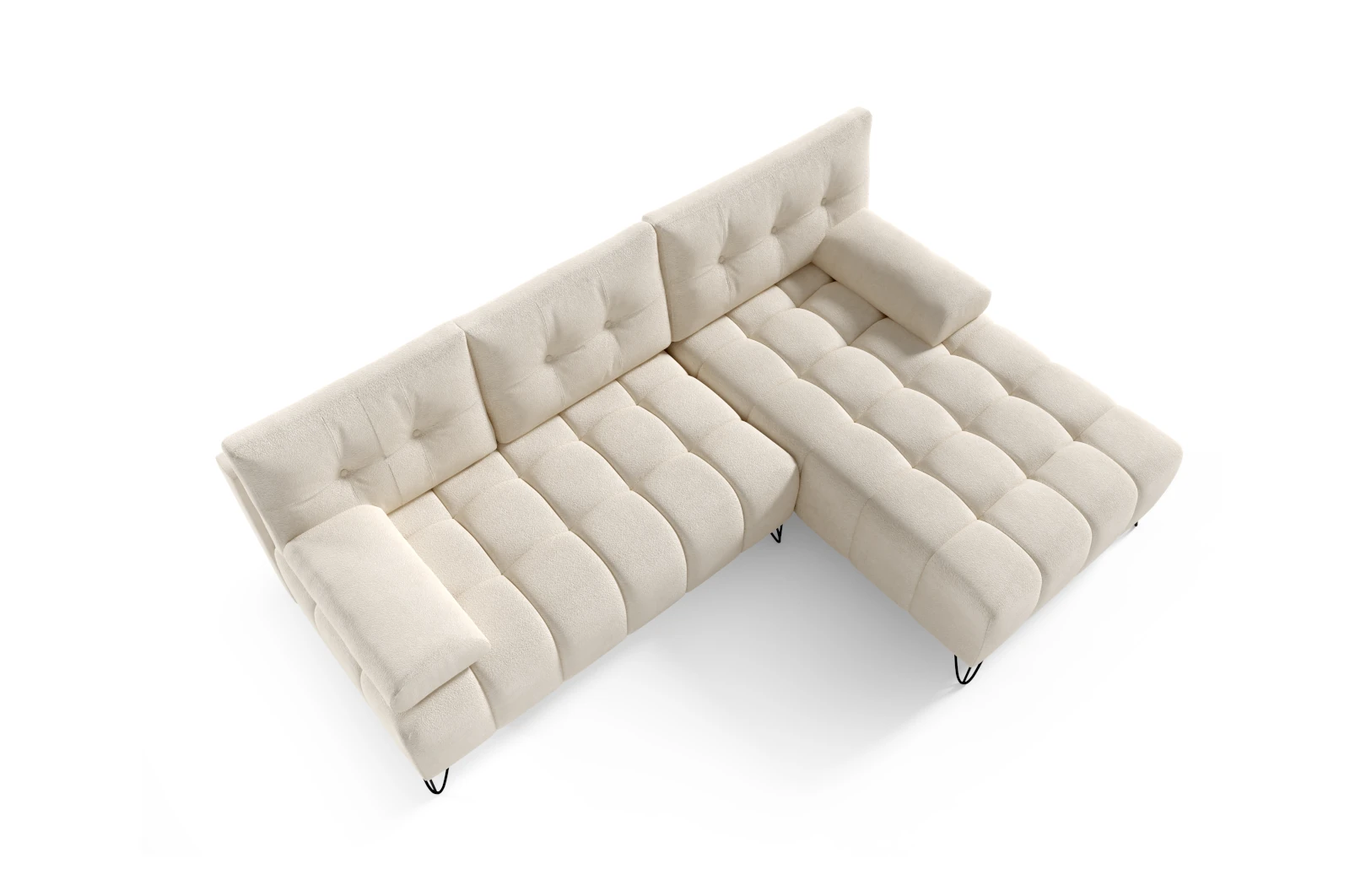 Aveline to narożnik, który łączy w sobie nowoczesny design z niezrównanym komfortem. Jego miękka, kremowa tapicerka w połączeniu z unikalnym, guziczkowym wzorem sprawia, że jest nie tylko praktyczny, ale także wyjątkowo stylowy.