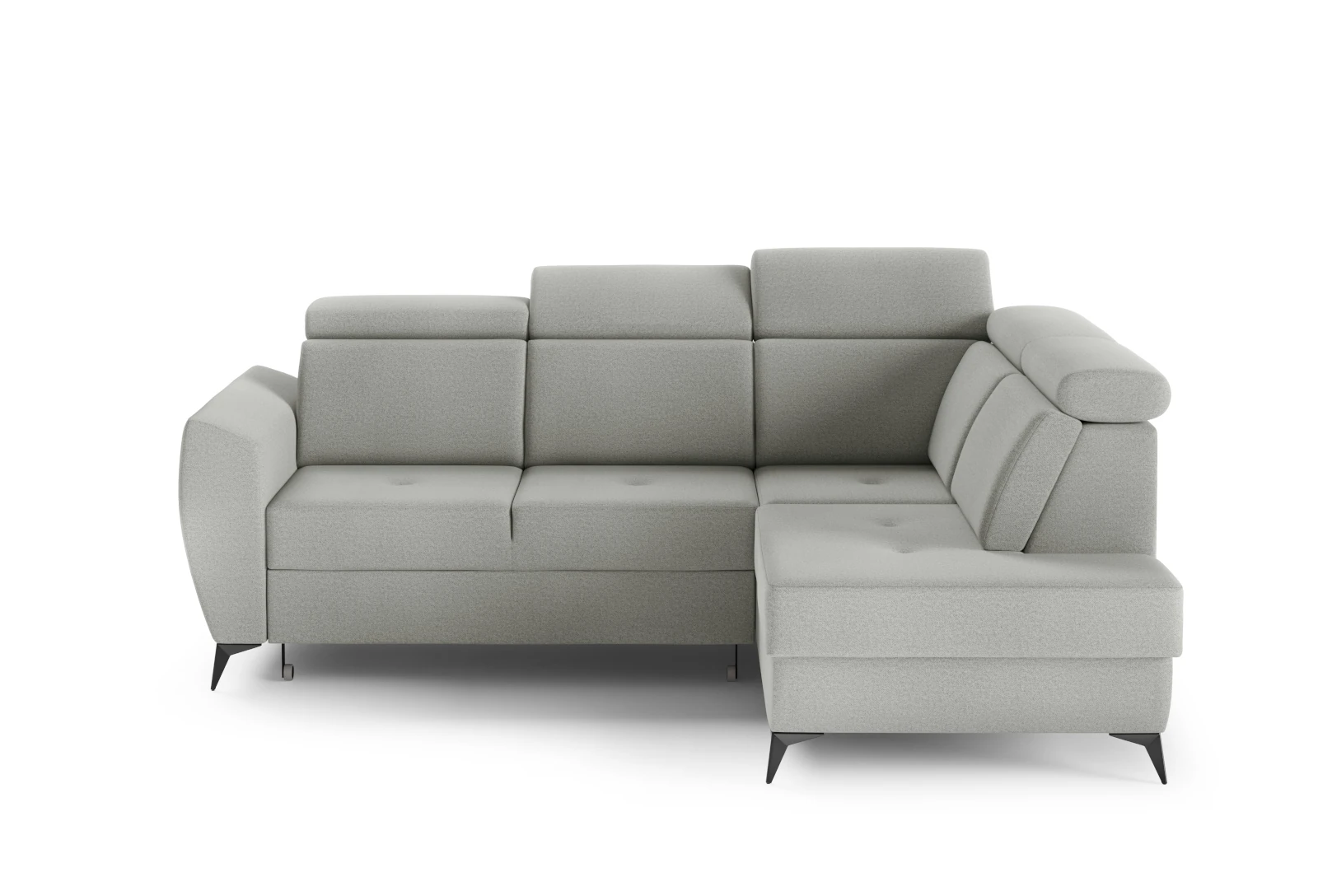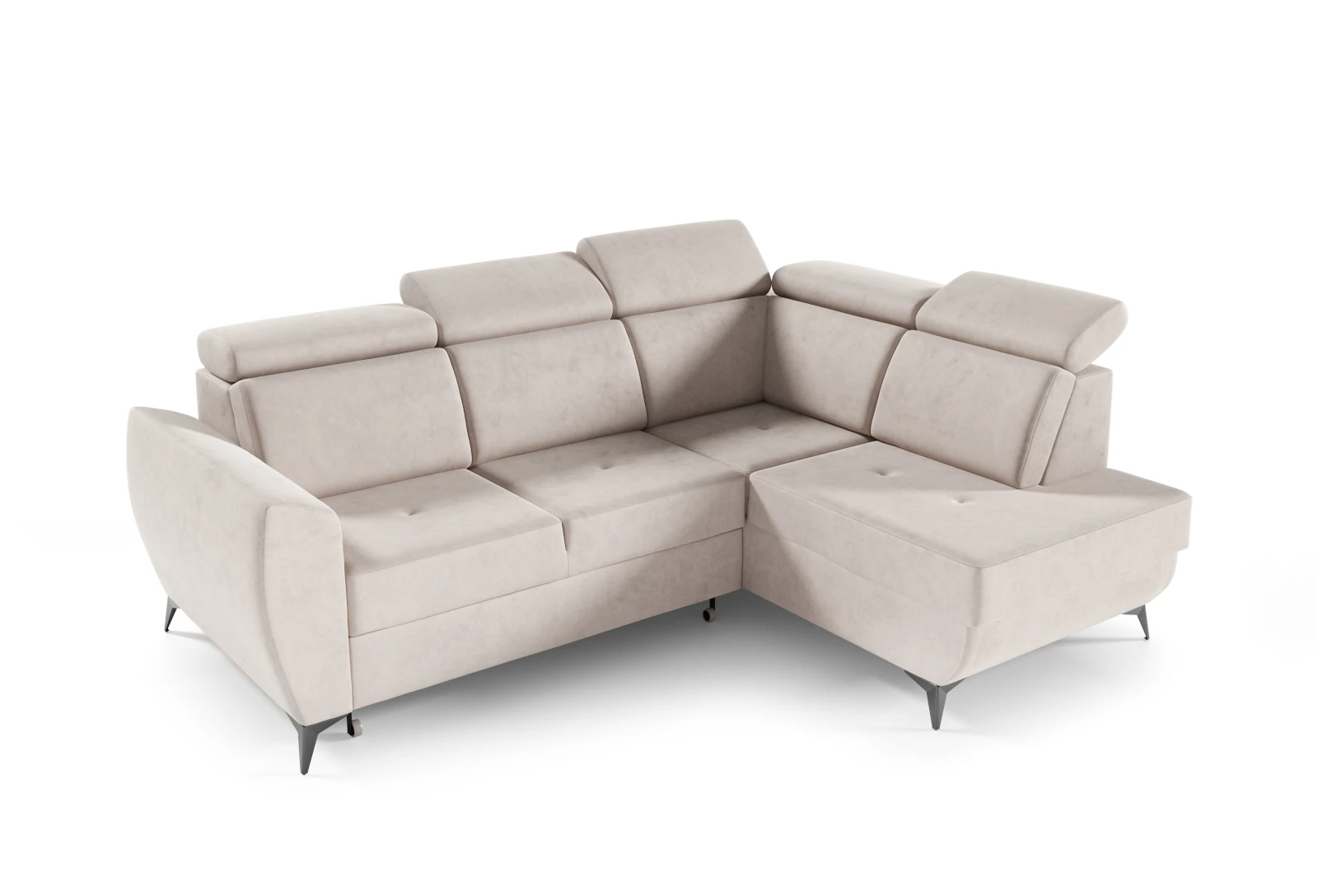 Ten narożnik łączy w sobie prostą formę z nowoczesnymi detalami, takimi jak regulowane zagłówki, które zapewniają wygodę na najwyższym poziomie, oraz wyraziste, metalowe nóżki, które nadają meblowi lekkości i współczesnego charakteru. Dante II to opcja dla tych, którzy szukają mebla o dużej funkcjonalności – jego regulowane elementy i komfortowe siedziska pozwolą Ci w pełni relaksować się po całym dniu.