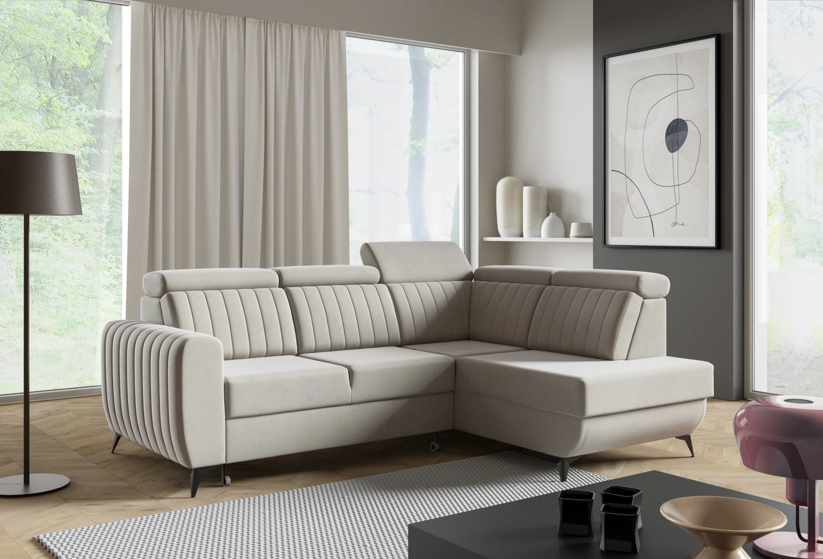 Pionowe przeszycia na oparciu nadają narożnikowi wyjątkowego charakteru, a subtelne, czarne nogi wprowadzają do całości lekkość, sprawiając, że mebel niemal unosi się w powietrzu. Jego nowoczesny wygląd świetnie wpasuje się zarówno w przestronne salony, jak i mniejsze mieszkania, dodając wnętrzu stylu, nie przytłaczając go.
