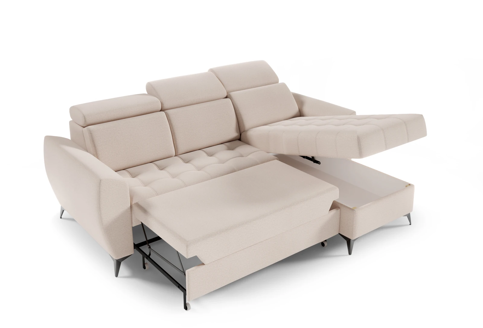 Wyjątkowe, tuftowane wykończenie siedziska i oparcia nadaje narożnikowi unikalnego charakteru, a metalowe nogi dodają mu nowoczesnego sznytu. Dzięki ergonomicznemu kształtowi oraz regulowanym oparciom Liora I zapewnia wyjątkowy komfort, który sprawia, że jest to idealne miejsce na odpoczynek po długim dniu.