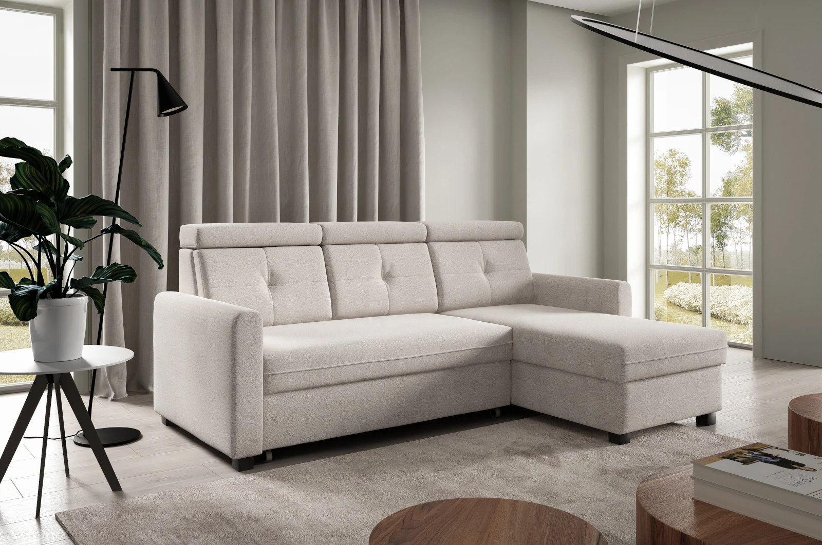 Tasmania to narożnik, który doskonale komponuje się z różnorodnymi stylami aranżacyjnymi – od nowoczesnych, po klasyczne wnętrza. Jego neutralny odcień łatwo dopasuje się do innych elementów wyposażenia, takich jak drewniane meble czy tkaniny w żywych kolorach, tworząc przestronny i elegancki salon.