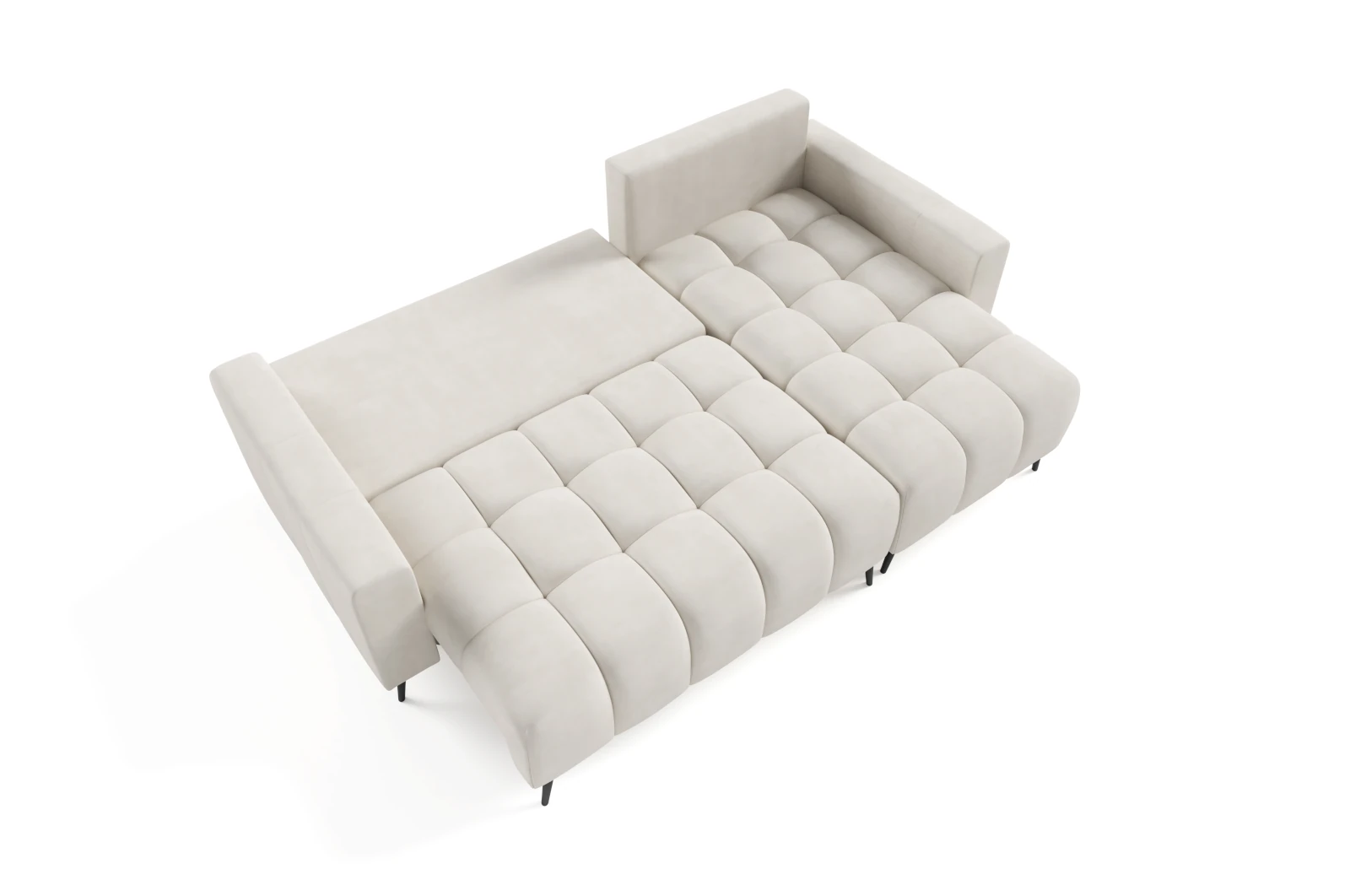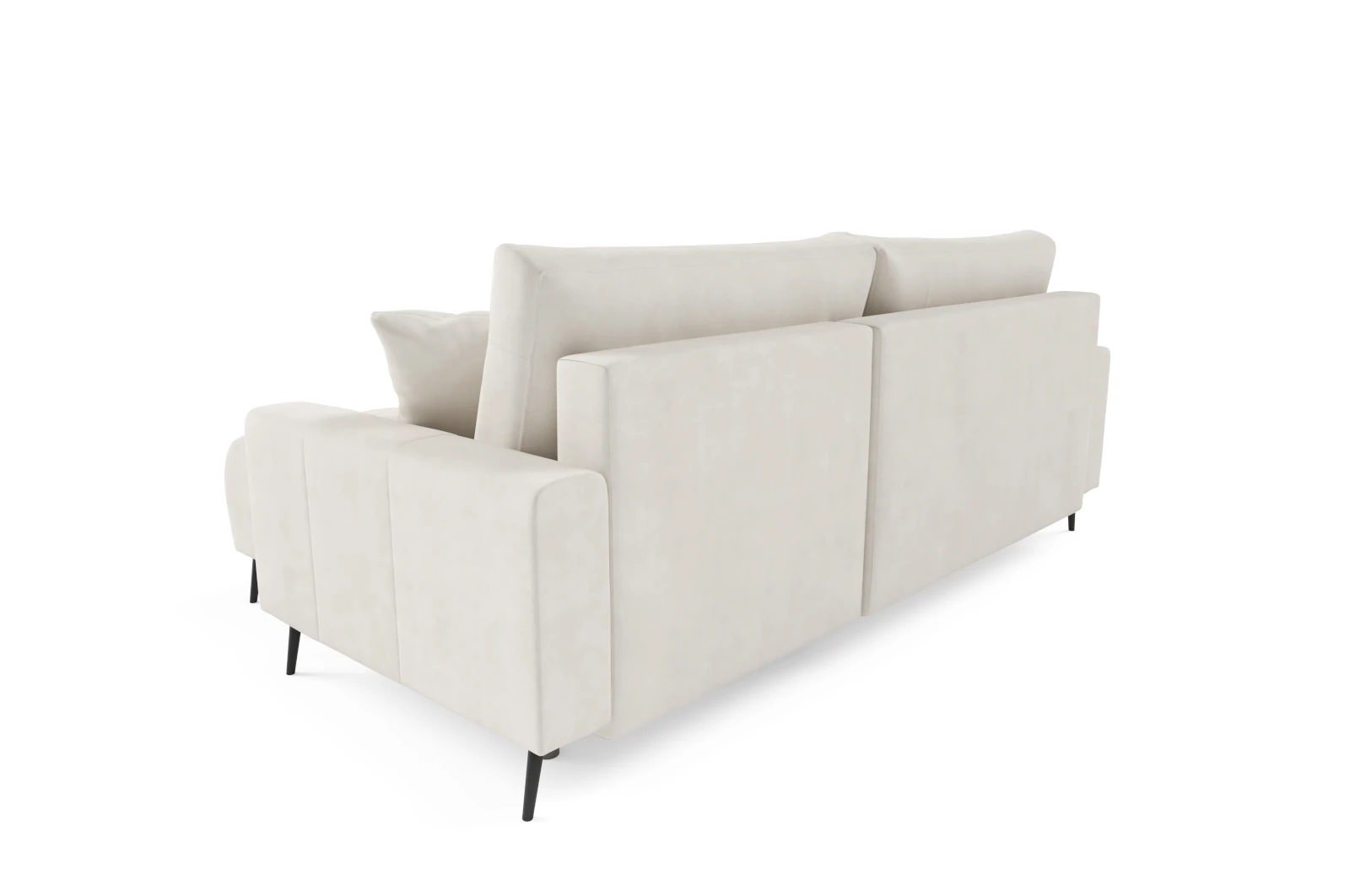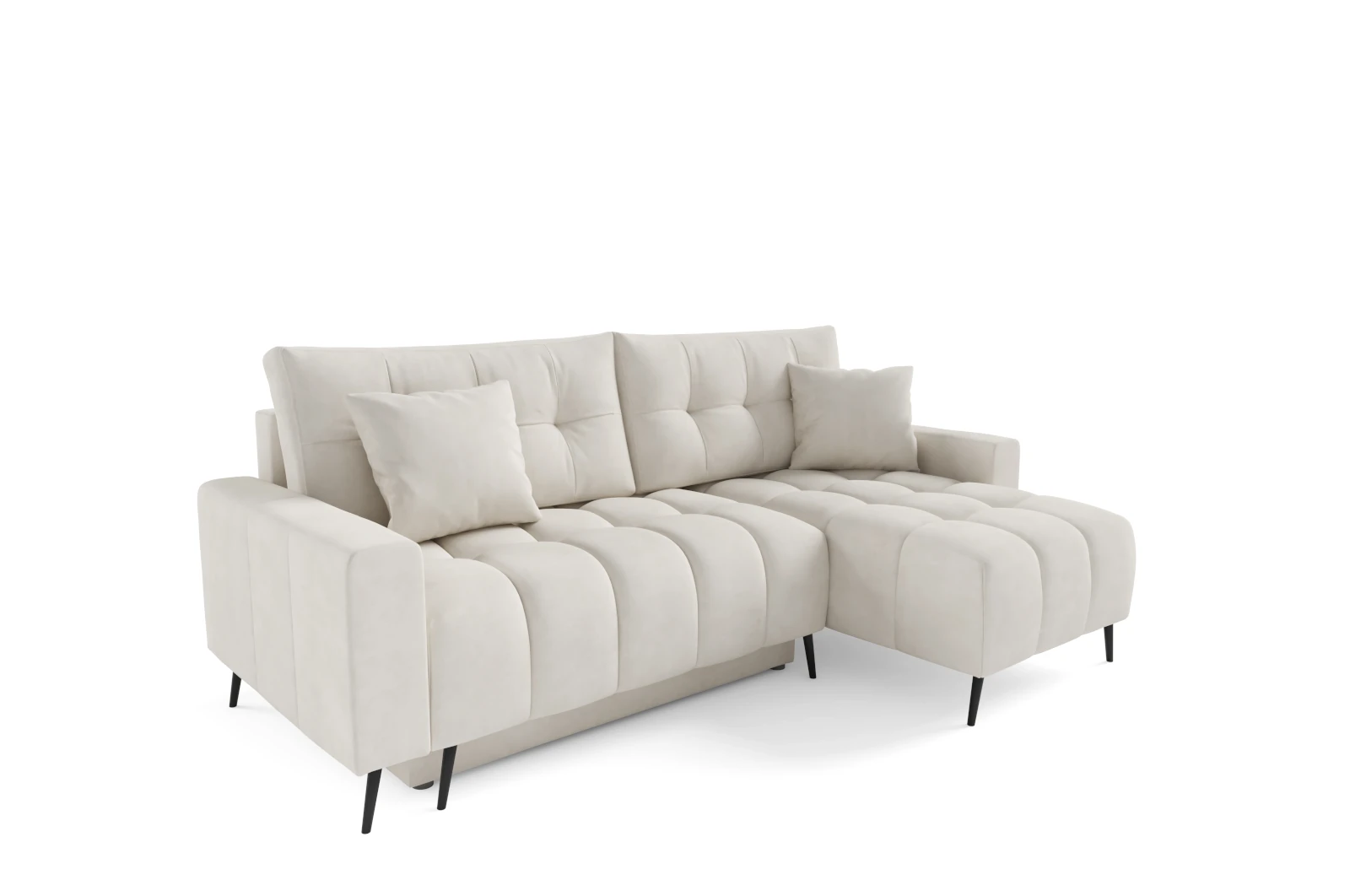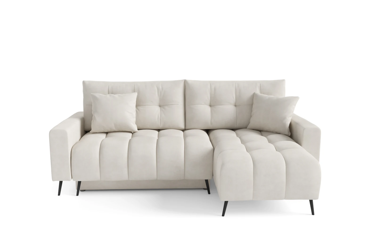 Narożnik Velino to prawdziwa oaza komfortu. Miękkie poduszki zapewniają nie tylko przyjemne oparcie, ale również doskonałą wygodę. Smukłe czarne nogi, dodające nowoczesnego charakteru, subtelnie unoszą całą konstrukcję, co daje wrażenie przestronności. Dzięki swojemu prostemu, ale atrakcyjnemu wyglądowi, Velino doskonale pasuje do różnorodnych stylów – od minimalistycznych po bardziej klasyczne wnętrza.