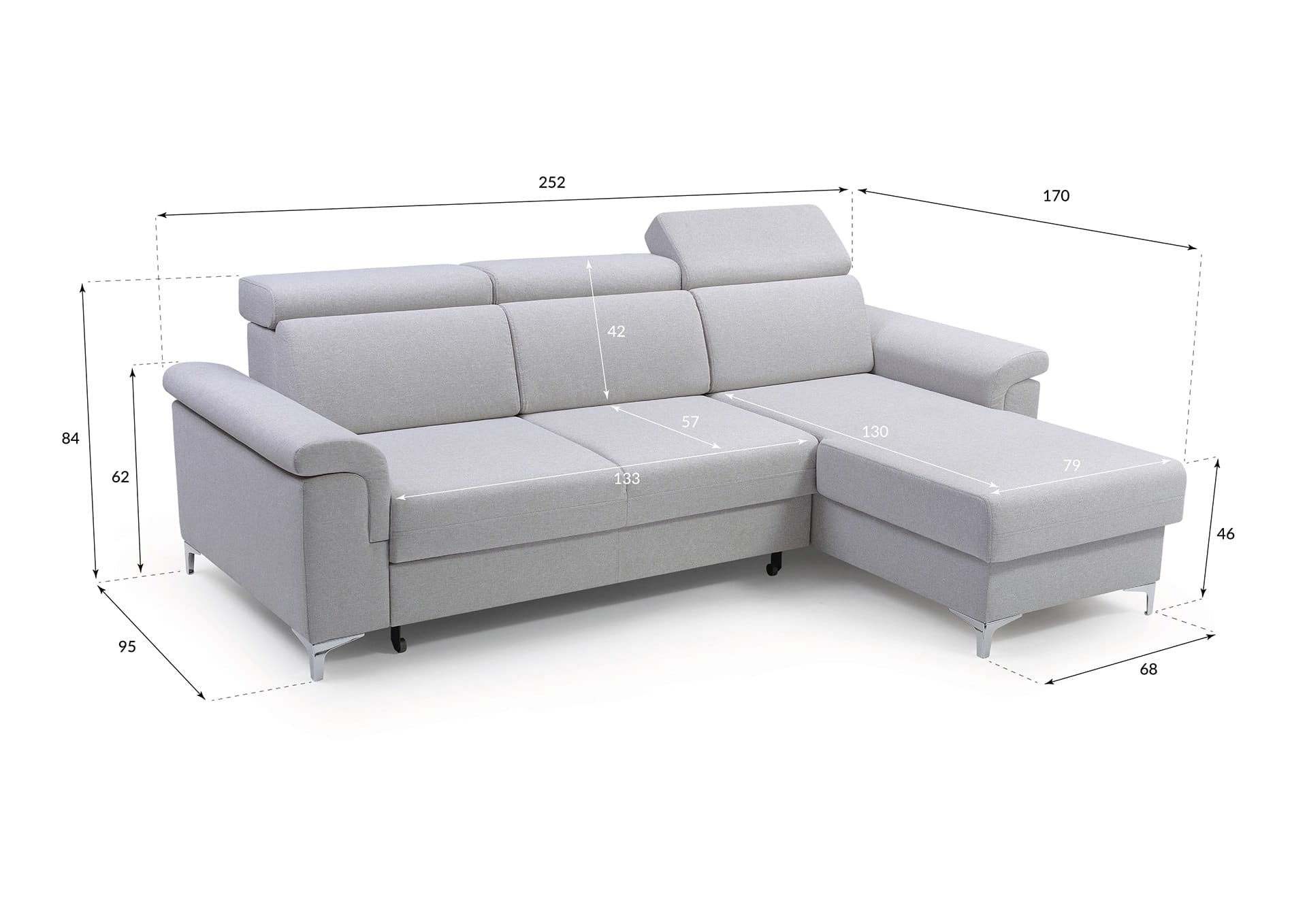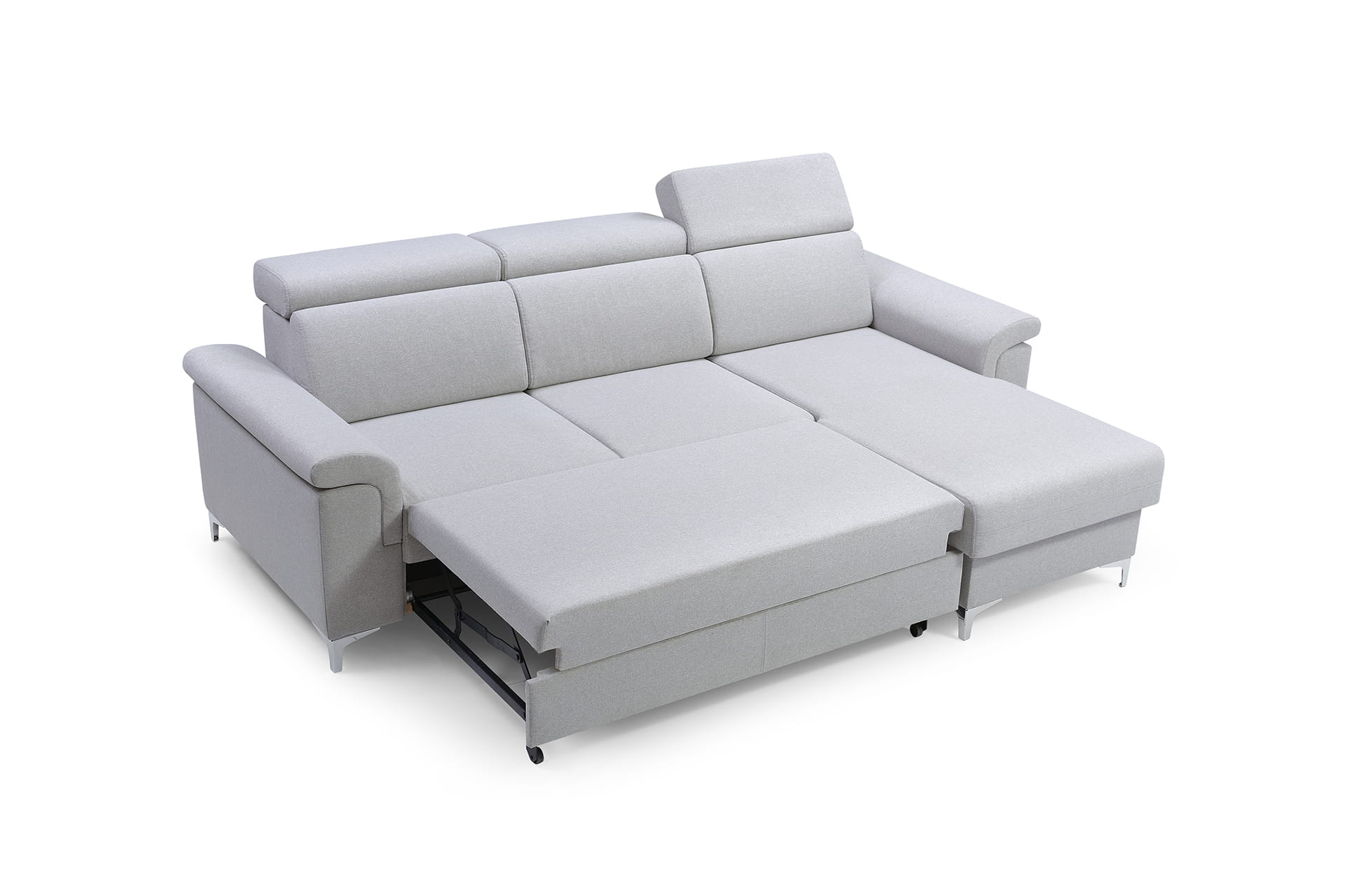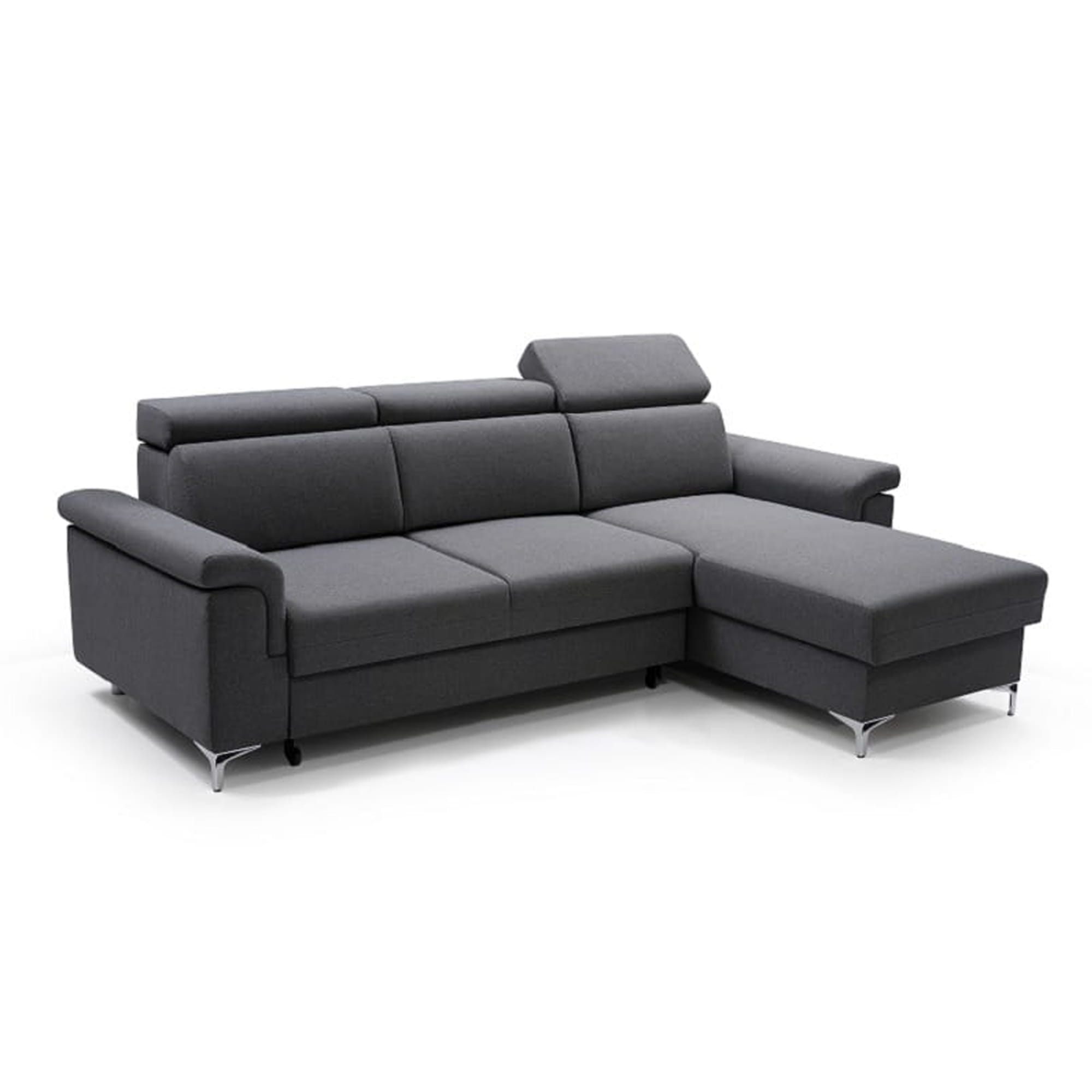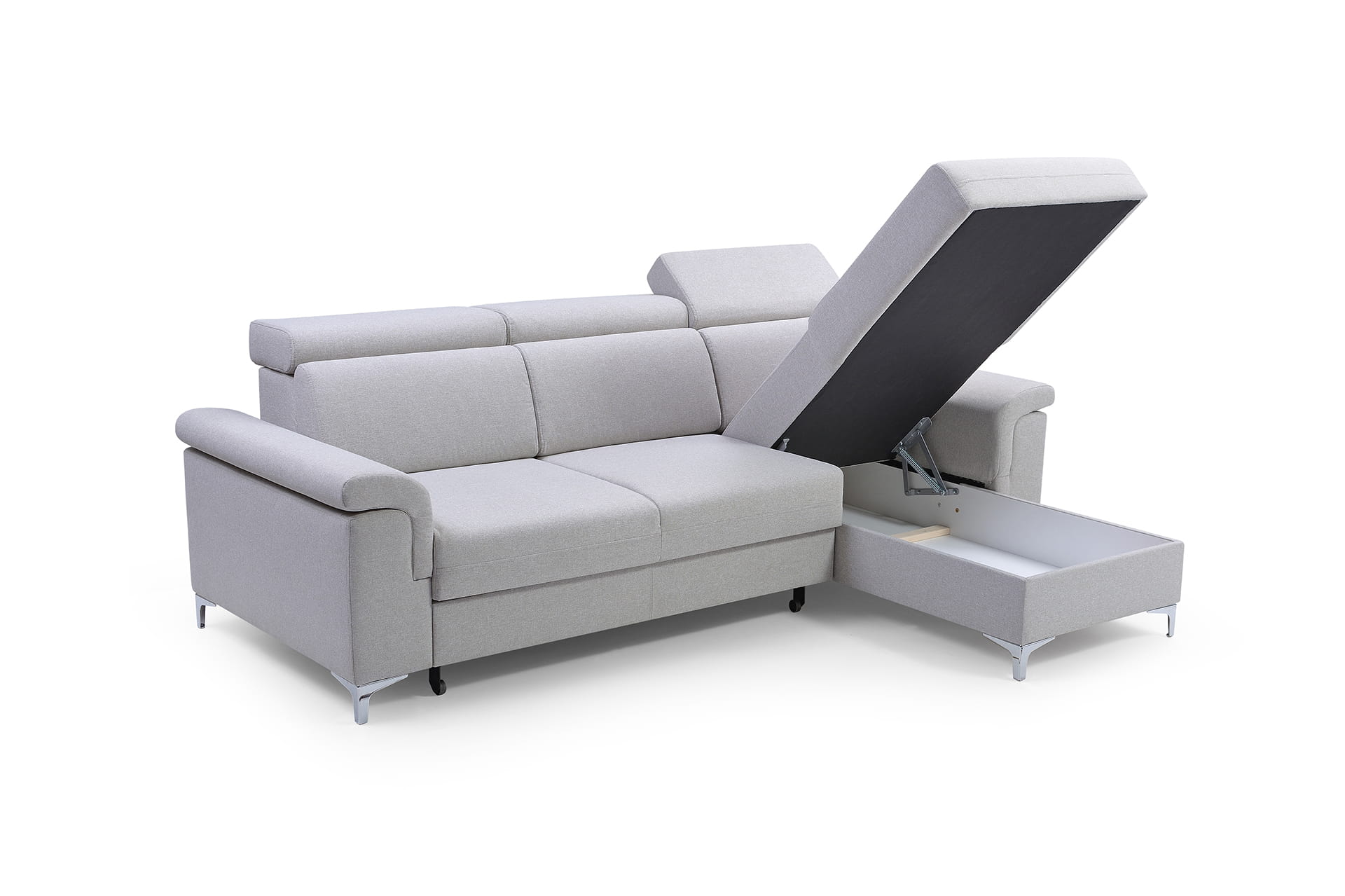 Narożnik z powadzeniem może zastąpić łóżko, ponieważ wyposażony został w fukcją spania oraz prosty mechanizm ułatwiający rozkładanie typu delfin. Praktyczny schowek na pościel ulokowany w otomanie mebla posłuży do przechowywani pościeli i tekstyliów domowych.