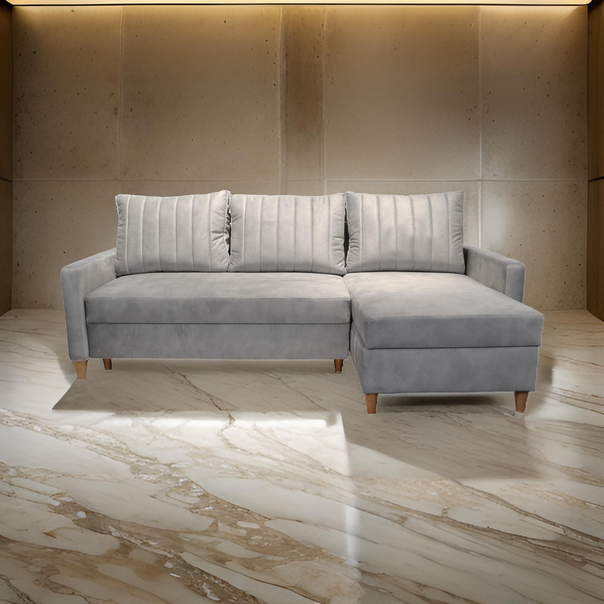 Szukasz eleganckiego i funkcjonalnego narożnika do swojego salonu? Odkryj narożnik z funkcją spania KARIM w kolorze szarym! Ten nowoczesny mebel o wymiarach 225x145 cm idealnie wpasuje się w każde wnętrze, oferując nie tylko miejsce do codziennego relaksu, ale także wygodne rozwiązanie do spania dla Twoich gości.
