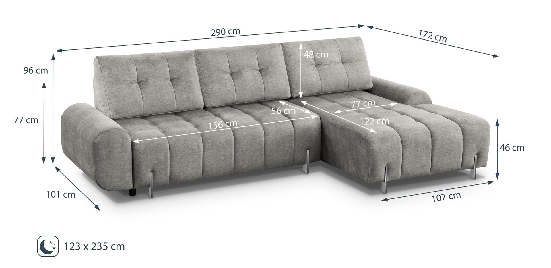 Narożnik z funkcją spania prawy RPCRR ciemnoszary 290x172 cm