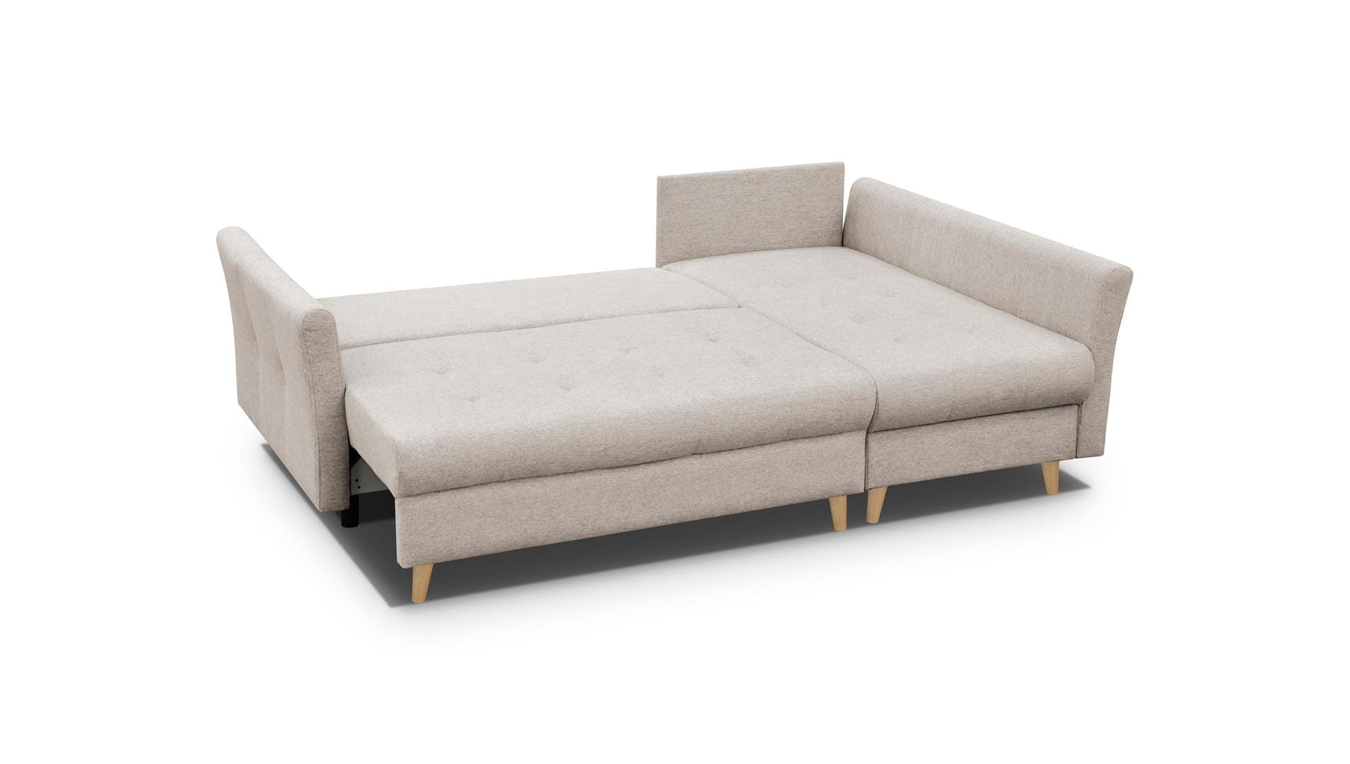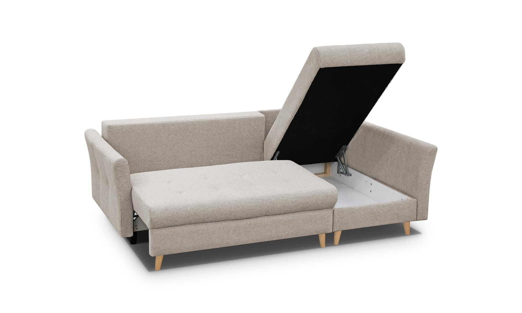 By rozłożyć narożnik wystarczy wysunąć stelaż z pod siedziska i pociągnąć materac za pomocą uchwytu. Mebel nie wymaga odsuwania od ściany.