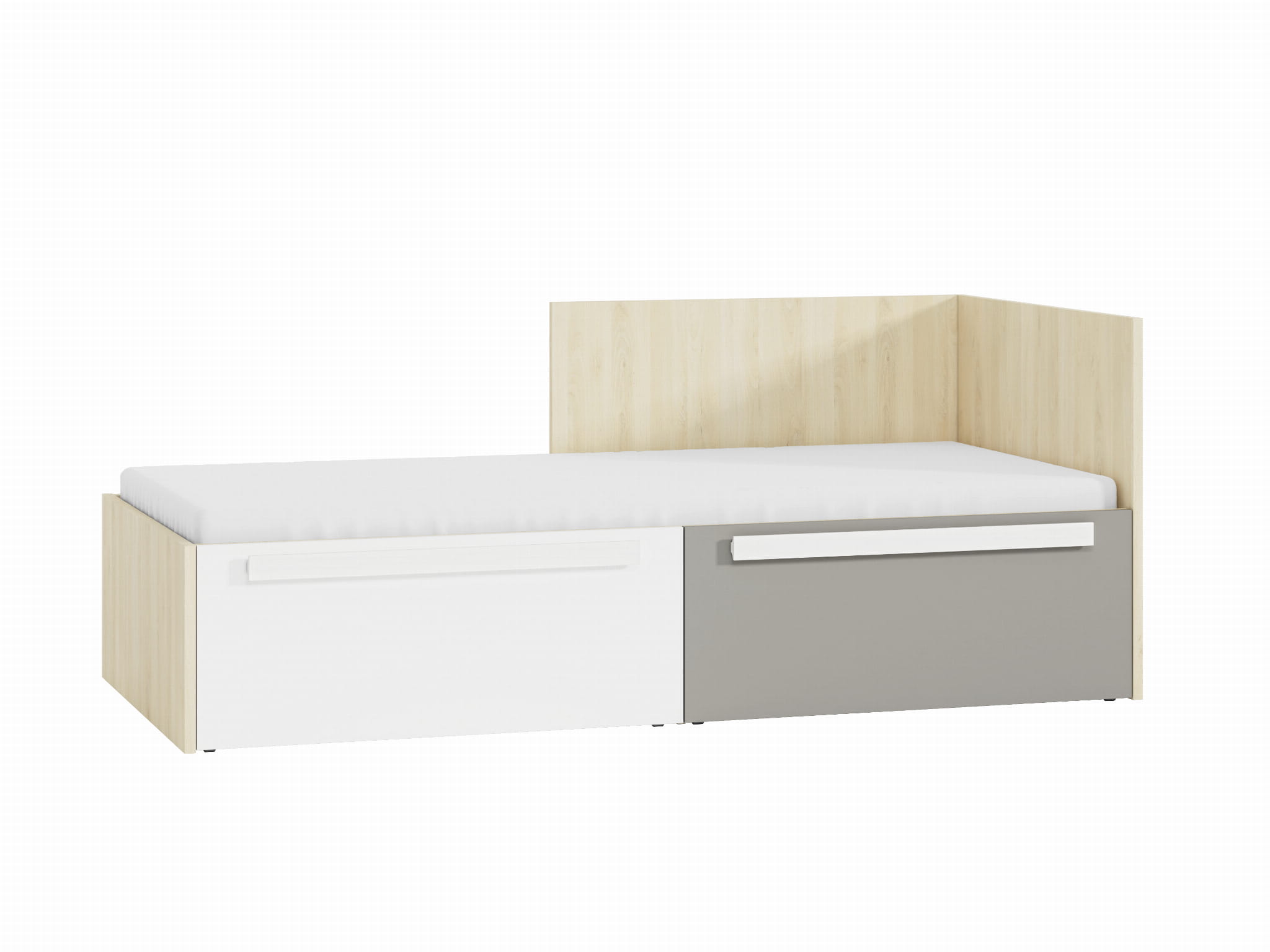 Oparcie do łóżka Nordo. Opcja dodatkowych oparć do łóżka młodzieżowego Nordo jest funkcjonalnym rozwiązaniem, dzięki któremu dziecko opierając się o łóżko nie brudzi ściany, przez oparcia można przerzucić złożone kocyki w kolorze aranżacji. Meble z kolekcji MNDR charakteryzują się korpusem w jasnym odcieniu drewna dąb fjord. Fronty w kolorze białym, dąb fjord i dwóch szarościach do wyboru, delikatnym jasnym szarym i wyrazistszej szarej platyny. Podłużne szeroki uchwyty w kolorze białym ułatwiają otwieranie szafek i szuflad mebla. Szeroki wachlarz wyboru brył z kolekcji. Meble Nordo to możliwość wielu zestawień i wyboru kolorów drzwiczek i ich rozmieszczenia w wielu meblach. Skandynawski design wybarwienia jasnego odcienia dębu zestawionego z bielą i szarościami to trend na czasie. Meble ciekawie prezentują się zarówno na tle barw pastelowych jak i z wyrazistymi dodatkami. polecane w szczególności jako zestawy do pokojów dziecięcych i młodzieżowych. Meble z powodzeniem doskonale sprawdzą się w innych pomieszczeniach, jak pokój dzienny, sypialnia czy też przedpokój.