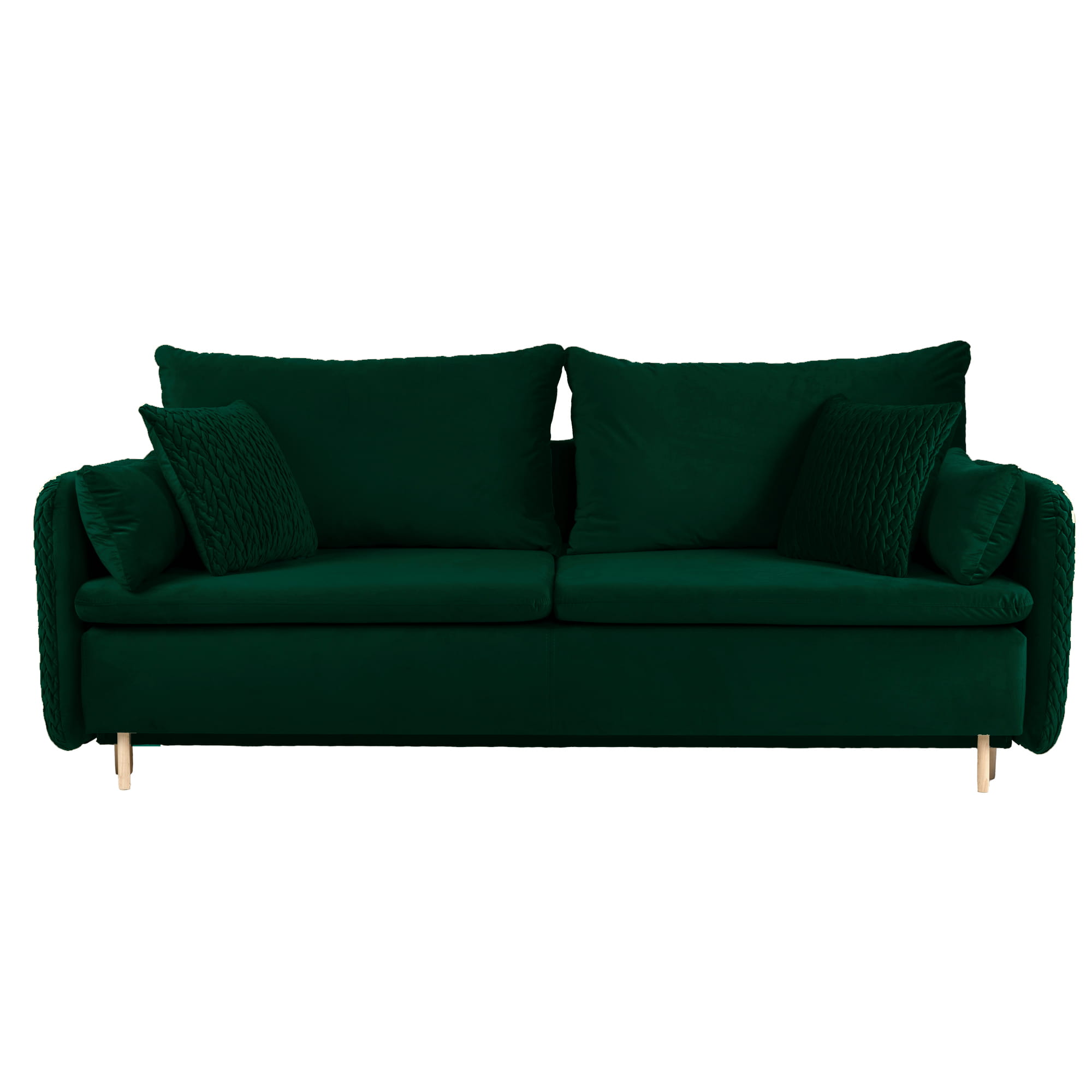 Sofa rozkładana MOONLA butelkowa zieleń z poduchami 215x94 cm z plecionką na bokach