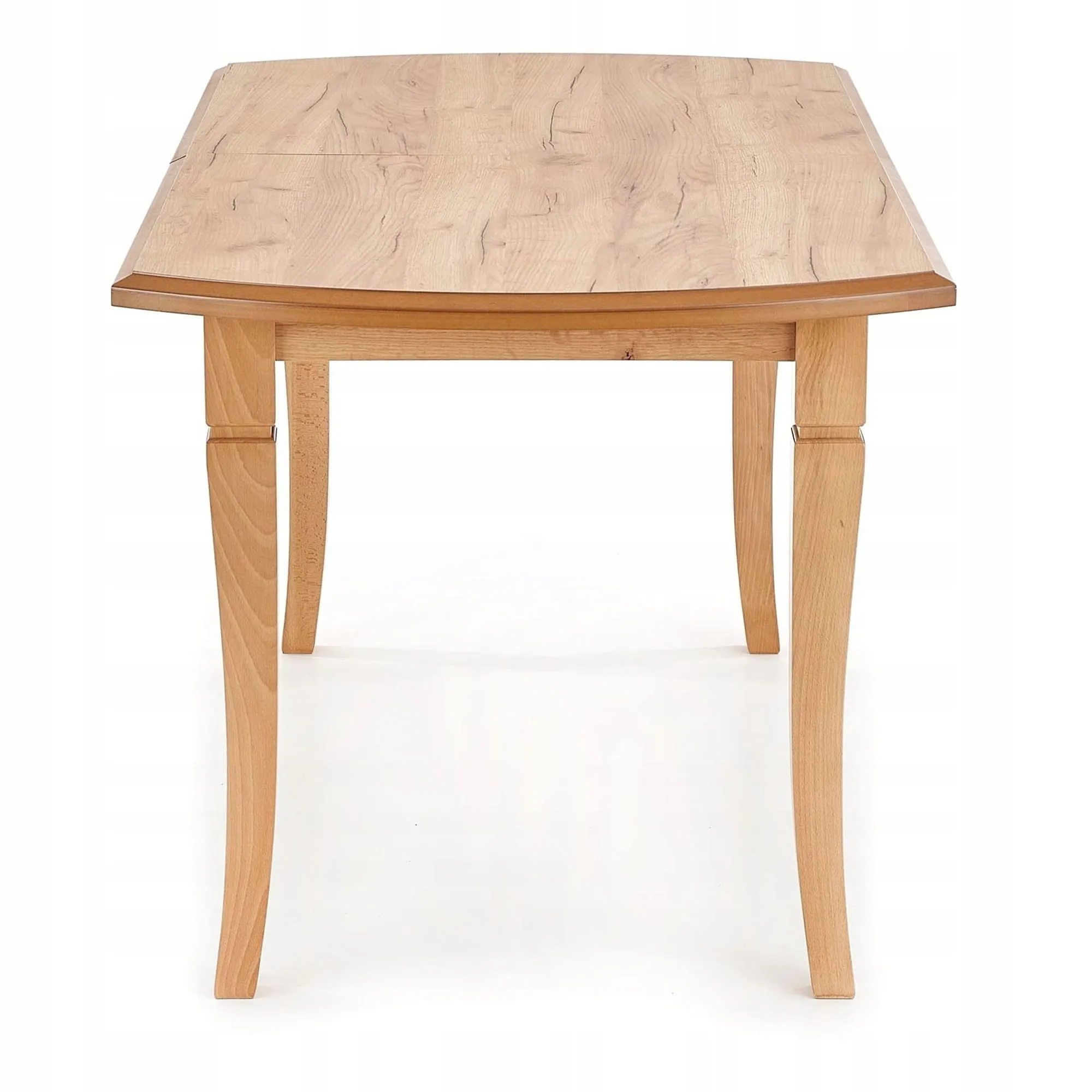 Stół FRYDERYK to model, który wyróżnia się pięknym dębowym kolorem. Dzięki niemu stworzysz w domu prawdziwy nastrój domowego ogniska. Stół ma lekko owalny blat, który uniesiony jest na czterech lekko giętych nogach, które dodają modelowi elegancji. Stół po rozłożeniu stworzy miejsce dla 10 osób. Blat stołu zrobiony jest z płyty MDF laminowanej a nogi z drewna litego bukowego. Blat się rozsuwa za pomocą prowadnicy metalowej i rolki. Drewno lite bukowe to materiał wytrzymały i solidny, ale jego największą zaletą jest to, że jest to materiał naturalny. Stół będzie idealnie pasował do wnętrz w stylu klasycznym.