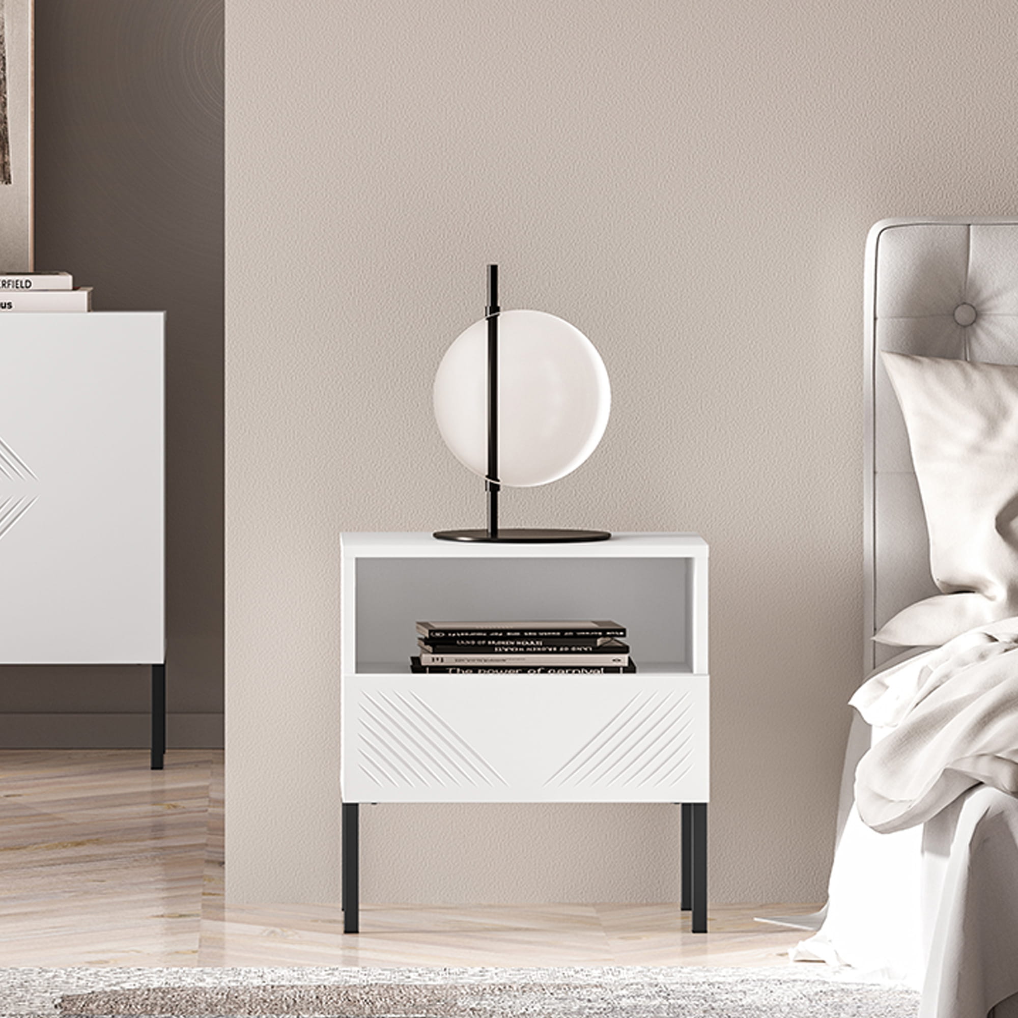Szafka nocna MALACO to stylowy i funkcjonalny mebel, który idealnie wkomponuje się w nowoczesne wnętrza. Kontrast białej powierzchni z czarnymi nóżkami dodaje szafce elegancji i sprawia, że staje się wyjątkowym elementem dekoracyjnym każdej sypialni.