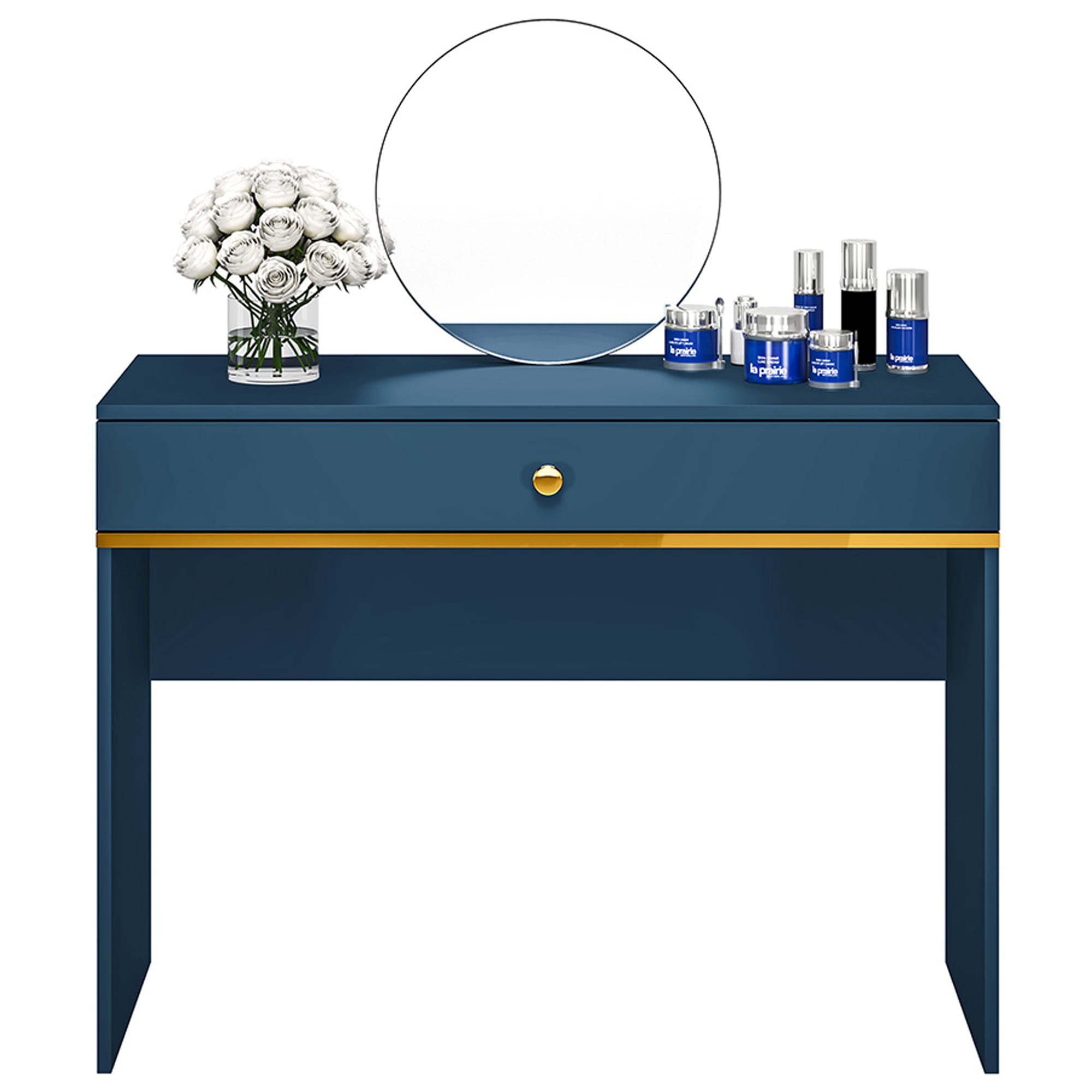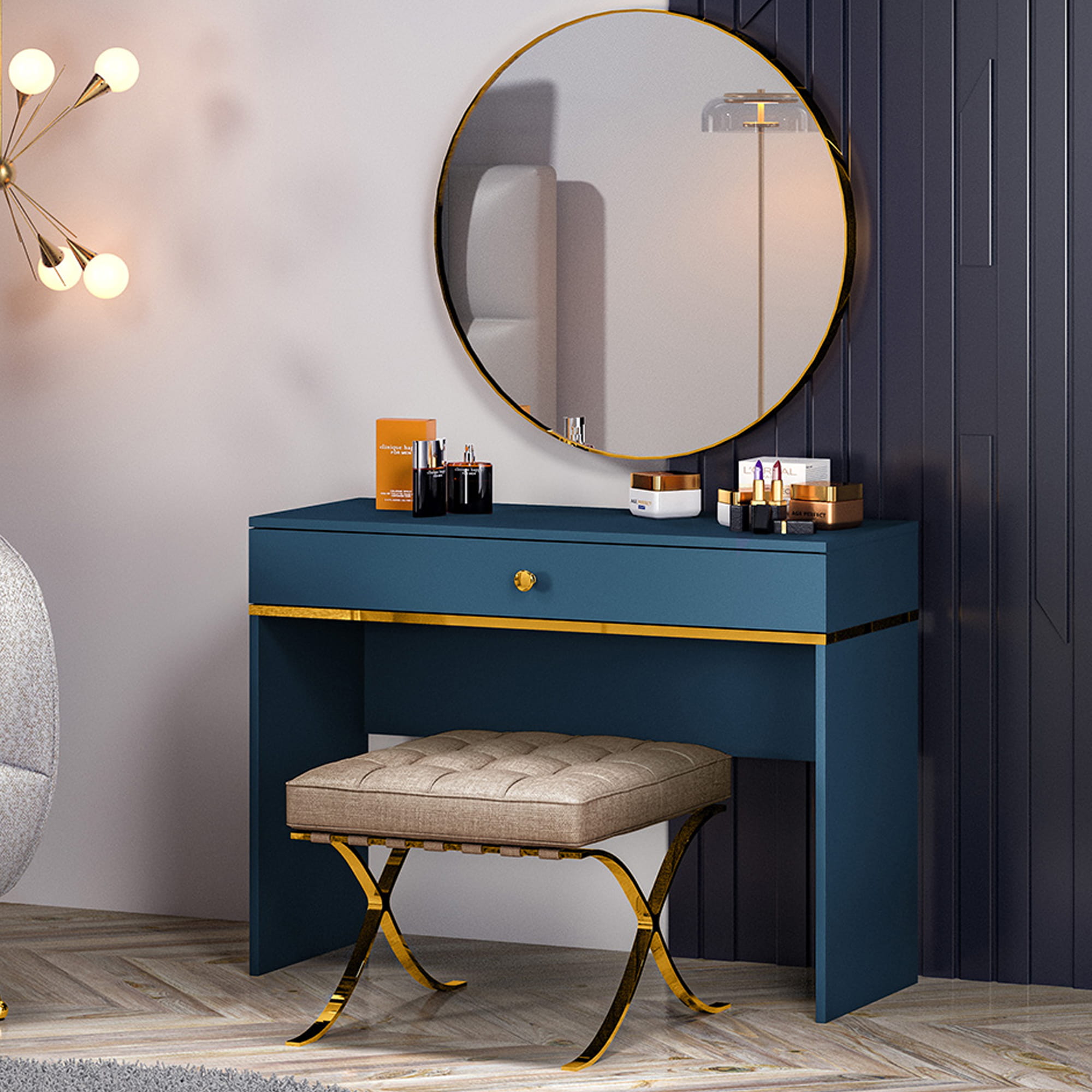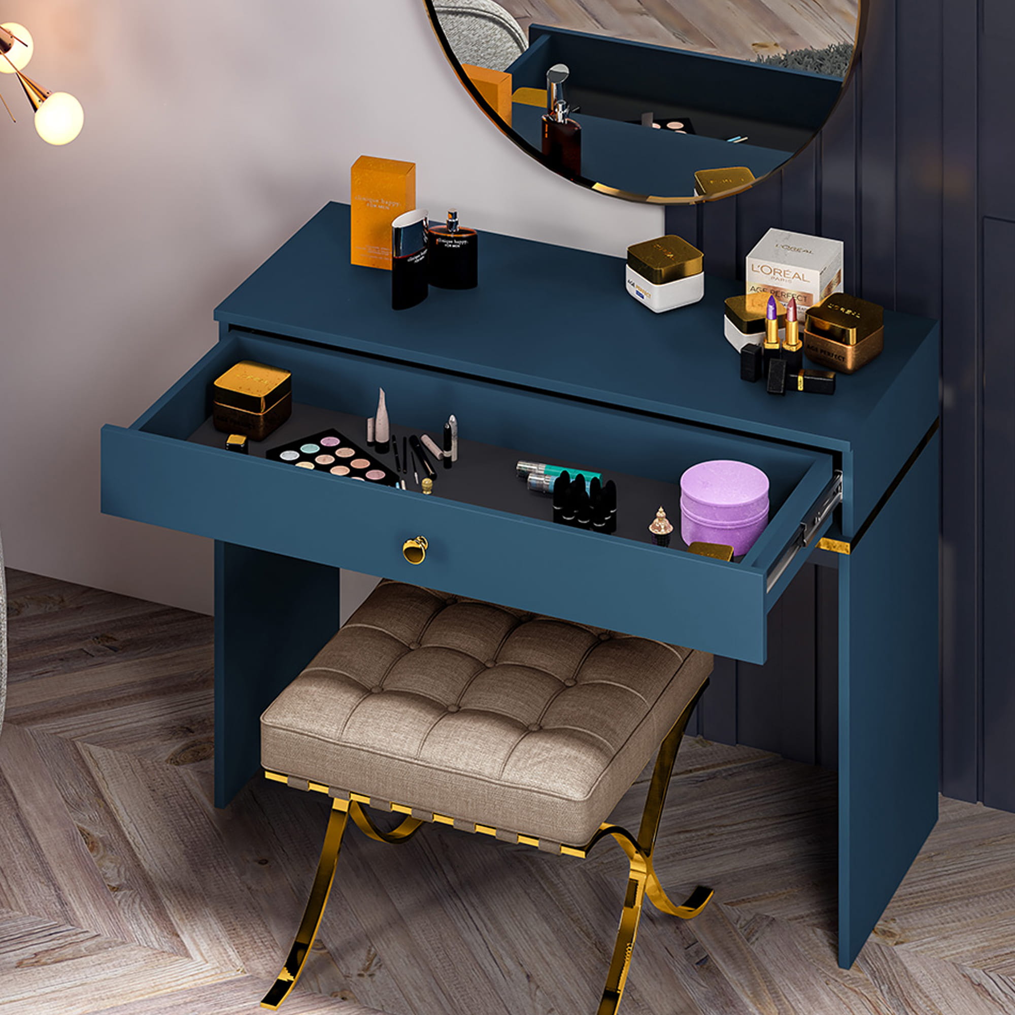 Toaletka z Szufladą MONTEVERDE - Niebieska z Złotym Uchwytem
