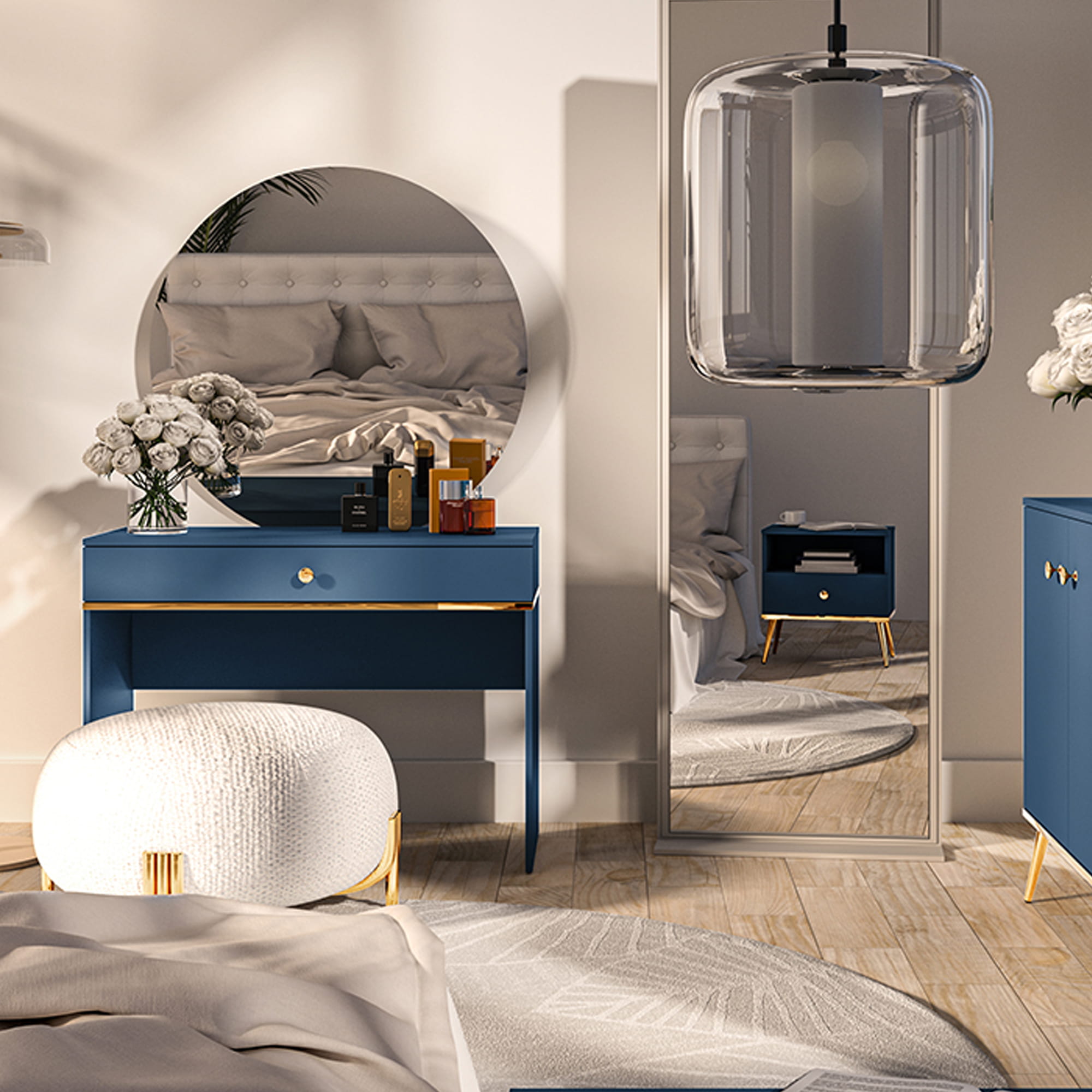 Toaletka MONTEVERDE to wyjątkowy mebel, który łączy elegancję z funkcjonalnością, idealny do każdego wnętrza. Jej głęboki, niebieski kolor wprowadza do przestrzeni harmonię i spokój, a złoty uchwyt nadaje jej luksusowego charakteru. To doskonały wybór dla osób, które pragną stworzyć stylowe i komfortowe miejsce do pielęgnacji oraz makijażu w sypialni lub łazience.
