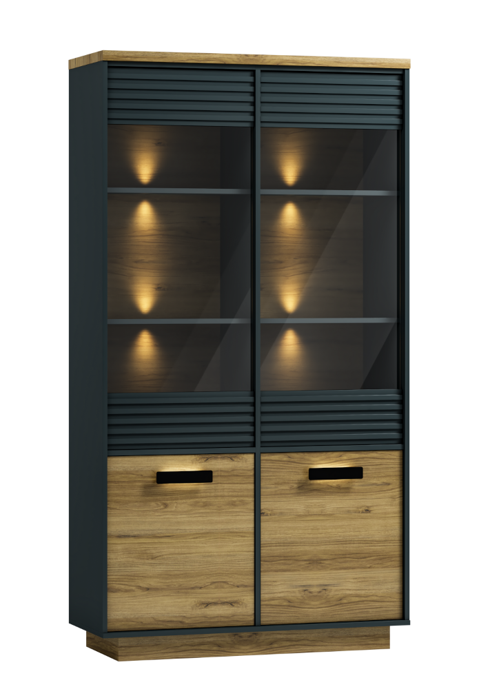Antracytowy kolor z delikatnymi akcentami dębu pradawnego nadaje witrynie elegancji i nowoczesności. Czarne wstawki podkreślają charakter mebla, dodając mu subtelności.